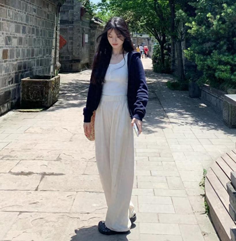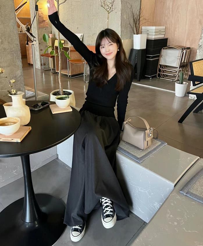 慵懶自在的穿搭,是我最喜歡的,鬆緊組合,輕鬆優化身材比例,還顯瘦,對於身材修飾也起到了很好的效果。黑色v領上衣+灰色西裝闊腿褲,寬鬆版型的褲子,也太藏肉顯瘦了。