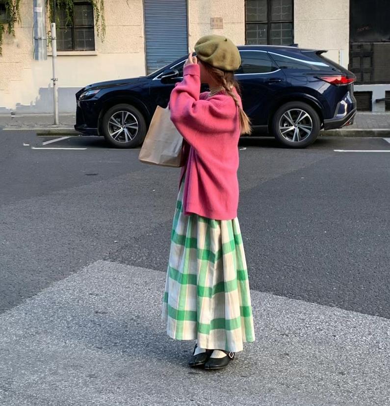 真的好愛這種感覺,撞色搭配就是吸睛洋氣極了,玫紅色毛衣開衫+格紋半身長裙,上簡下繁的組合,輕鬆打造出層次感,可時髦了。
