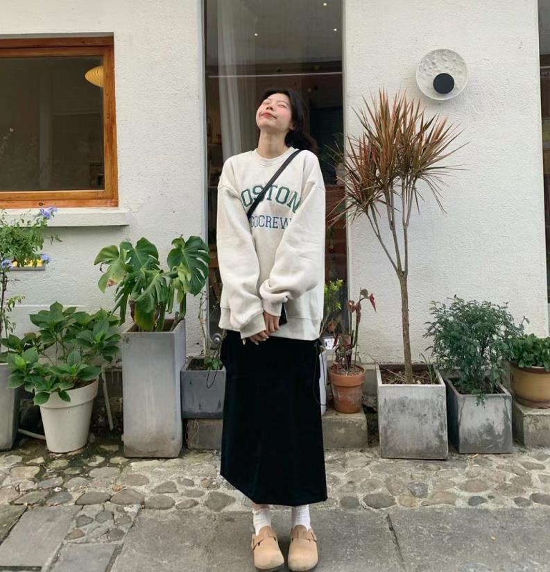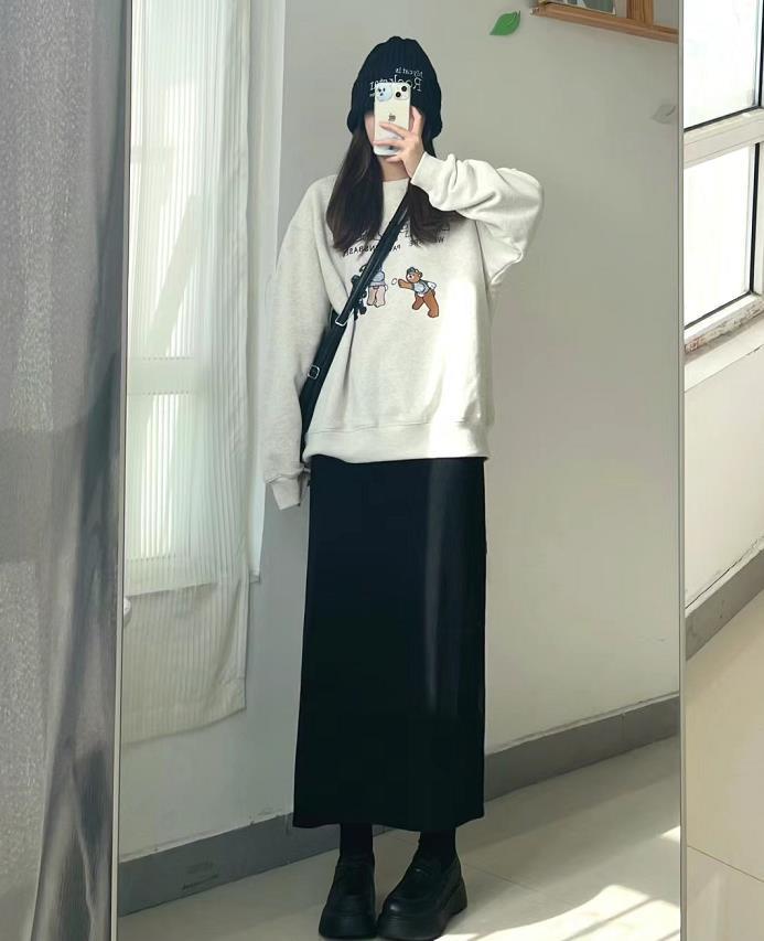 好喜歡這套,太韓了,小熊衛衣看起來就很可愛,趣味感十足,黑色的半身長裙,版型是偏直筒形狀的,藏肉顯瘦又不挑人。