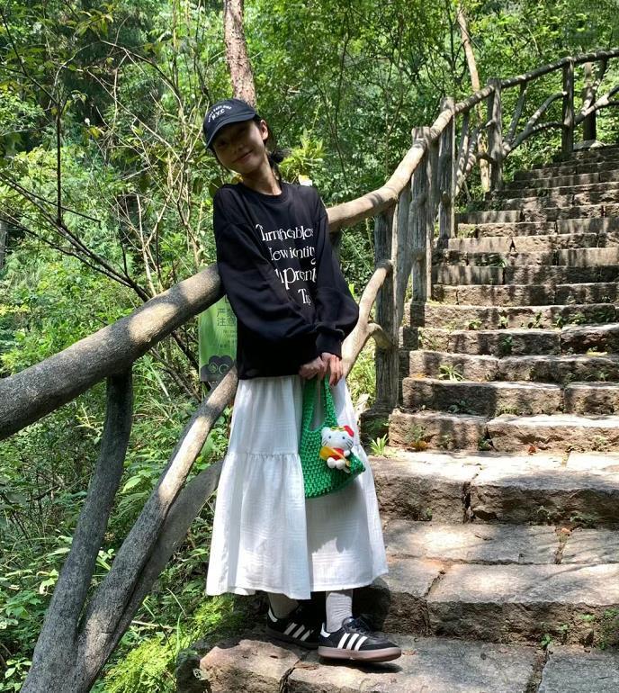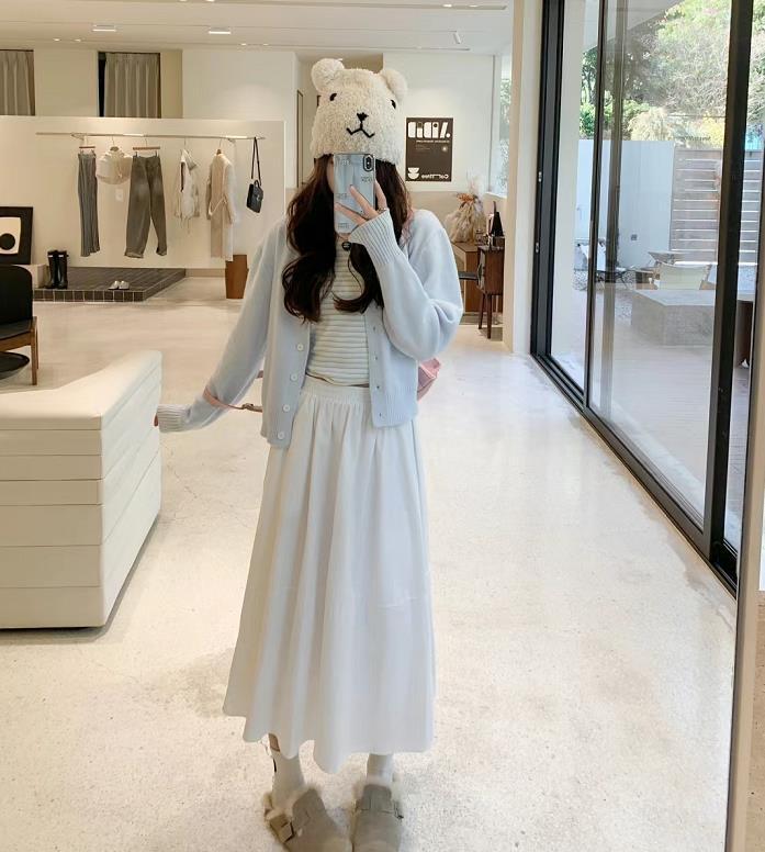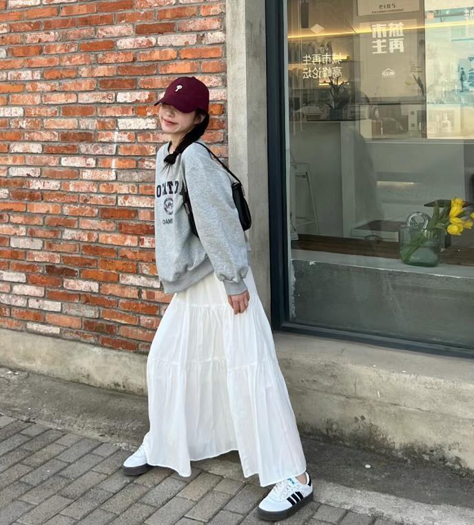 搭配白色半身長裙,再加上棒球帽點綴,很韓系的穿搭。