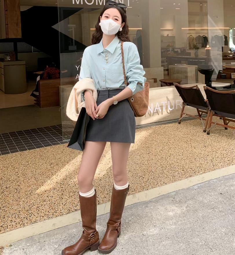 復古韓系的一套,春天這麼穿正好,版型適中的西裝外套,內搭進行了疊穿,增加層次感又保暖。下身搭配的白色半身牛仔裙,巧妙將身上的缺點給隱藏起來了。