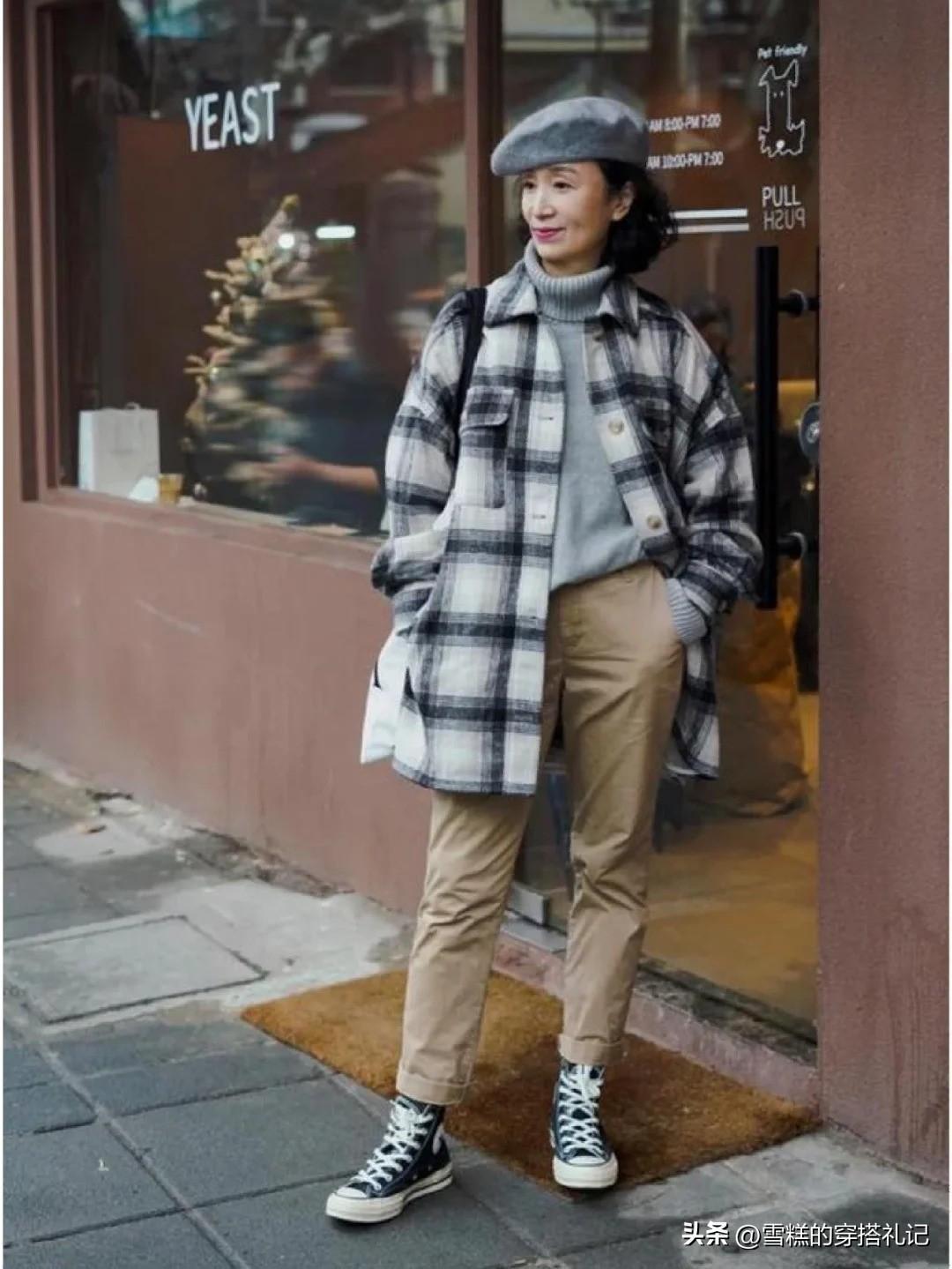 疊穿上衣的方法,也是三木媽媽經常運用到的穿搭方法。像這樣利用一件帶着格紋設計外套,裏面搭配一件純色的毛衣,就能瞬間製造出內外層次視覺繁簡上遞進。