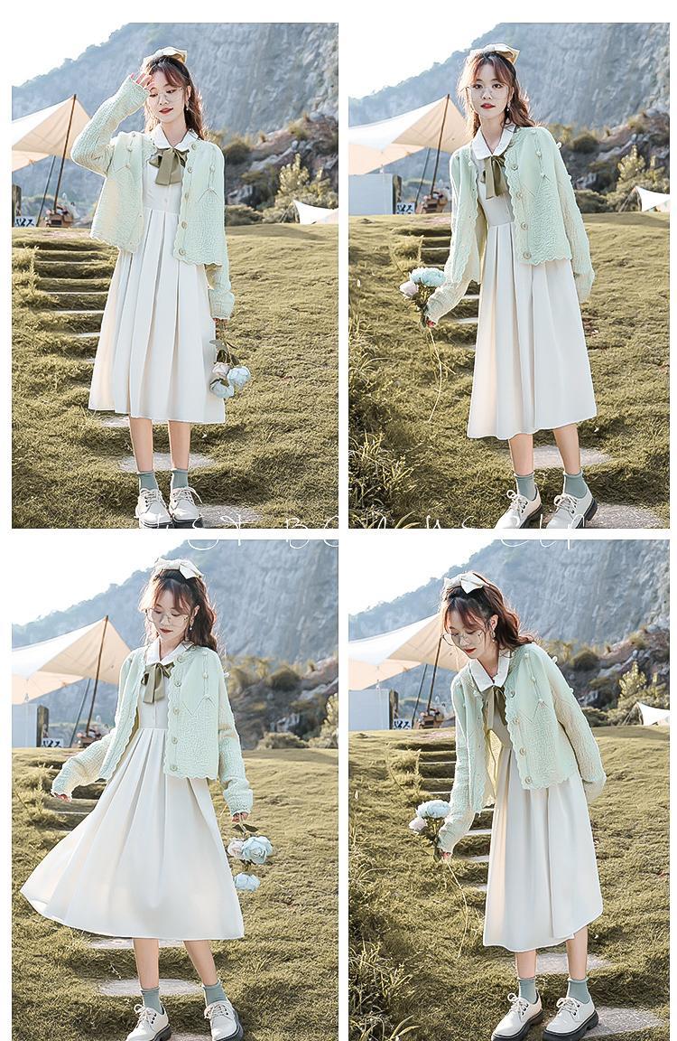 針織衫+碎花連衣裙:這個組合非常常見和百搭,適合所有身材。