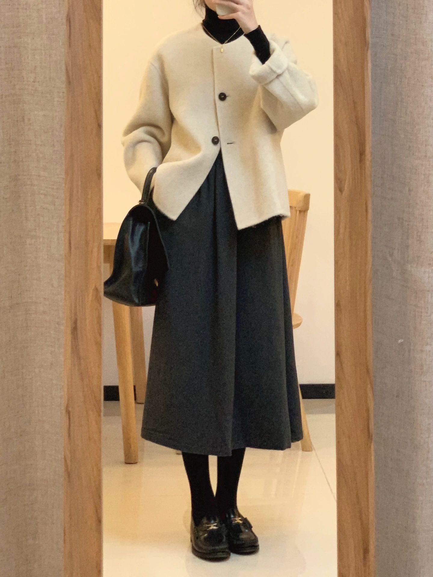 想要突出優雅的感覺,短款羊絨大衣也可以與裙子搭配,可以選擇長筒靴或短靴,時髦度up up。