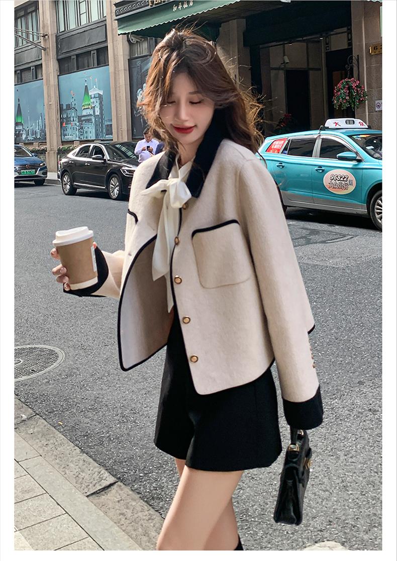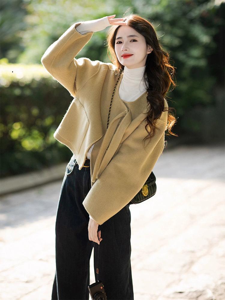 羊絨大衣本身厚度不高,保暖性還不錯,短款的設計作爲開春來穿,非常適合。