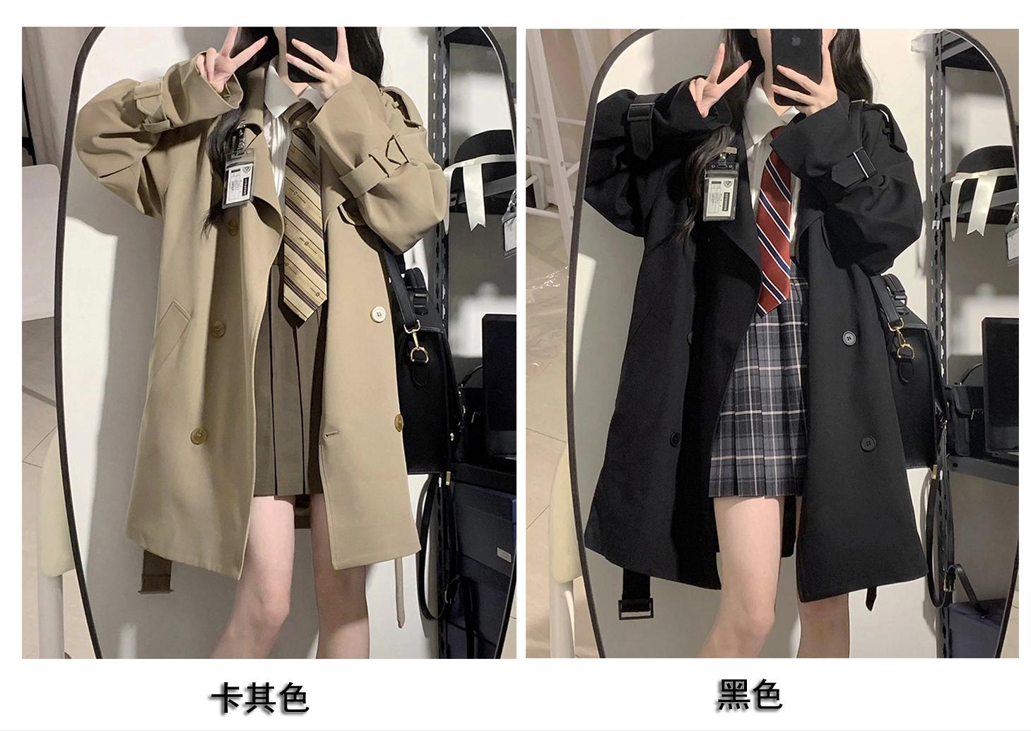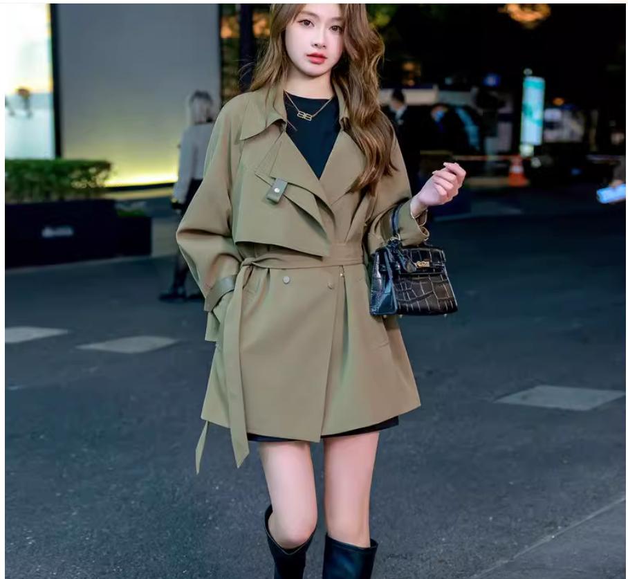 短款風衣搭配中長款的連衣裙,利用“外短內長”技巧,展現出腿部的美感。