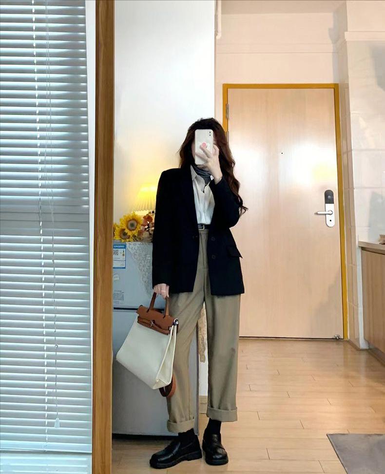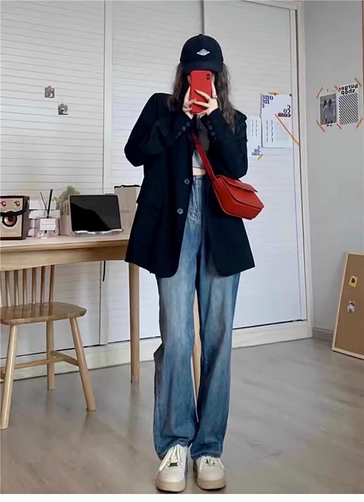 T恤+直筒褲+西裝外套:選擇基礎的白色長袖T恤作爲內搭+寬鬆的直筒褲,瞬間讓造型感提升了,越是基礎百搭的單品,越適合所有人。