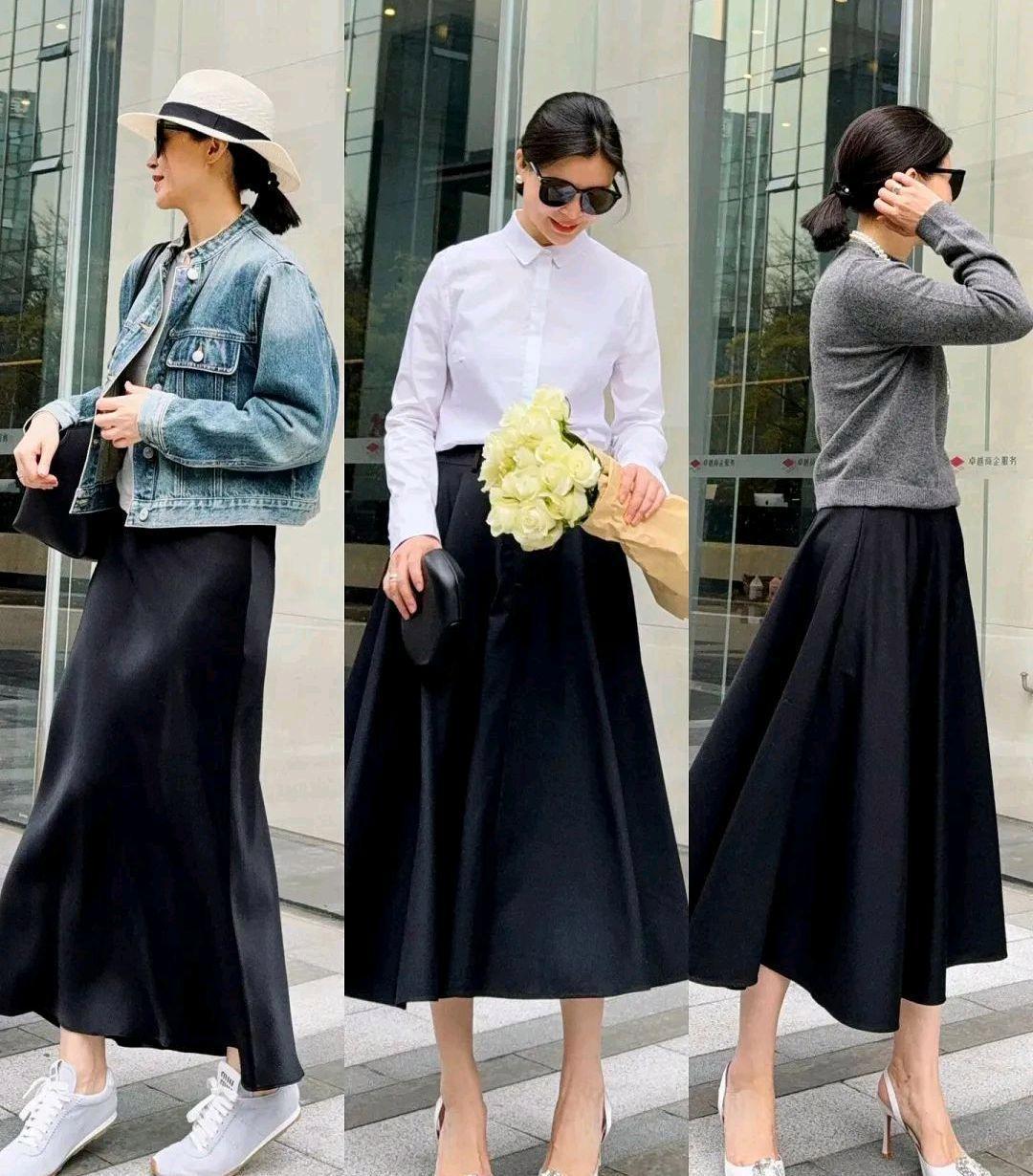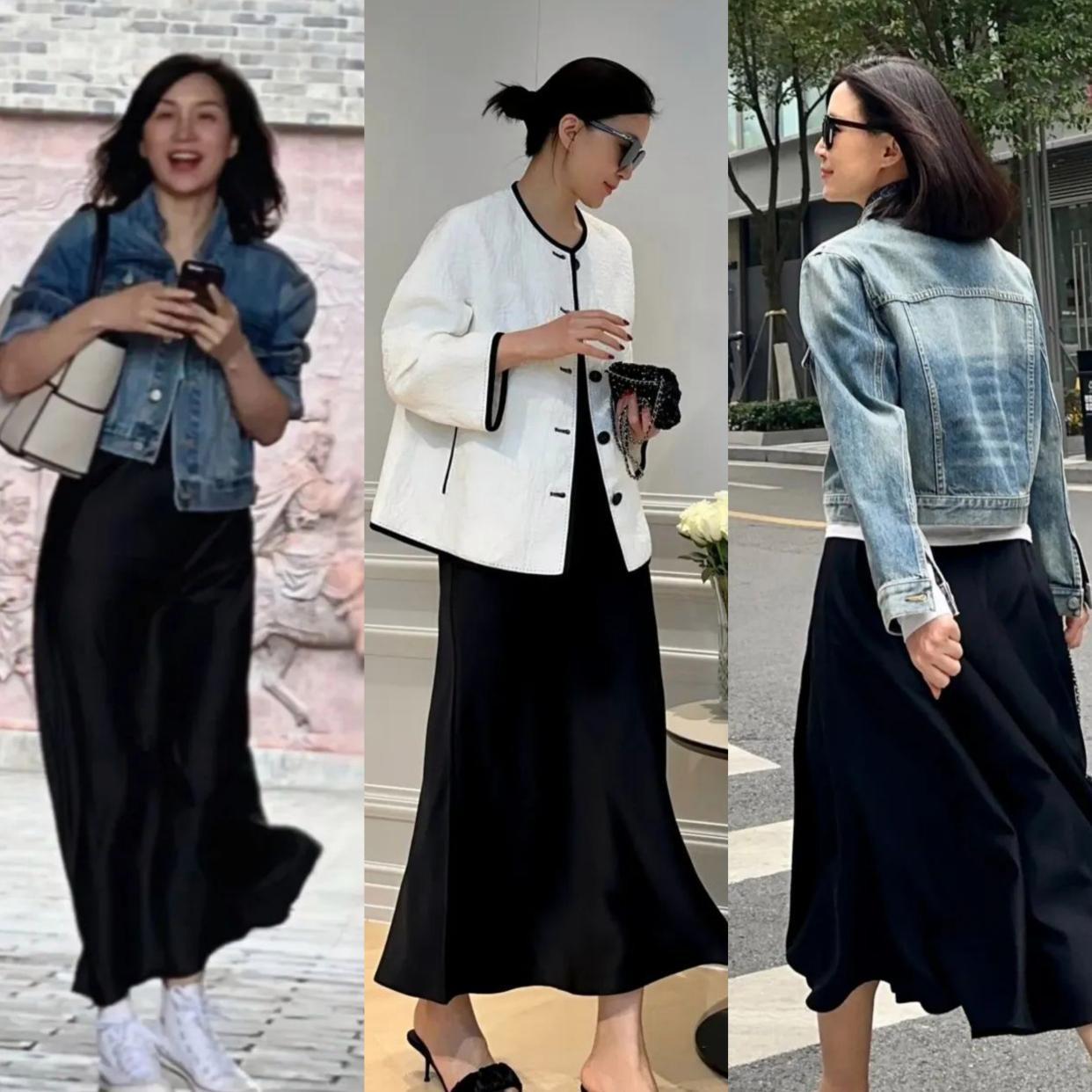 牛仔外套搭配黑色的半身裙,黑色半身裙我們可以稍微高腰的款式,高腰的黑色半身裙更加溫柔,還可以修飾身形。飄逸的裙襬、帶着幾分浪漫,時髦又大方。