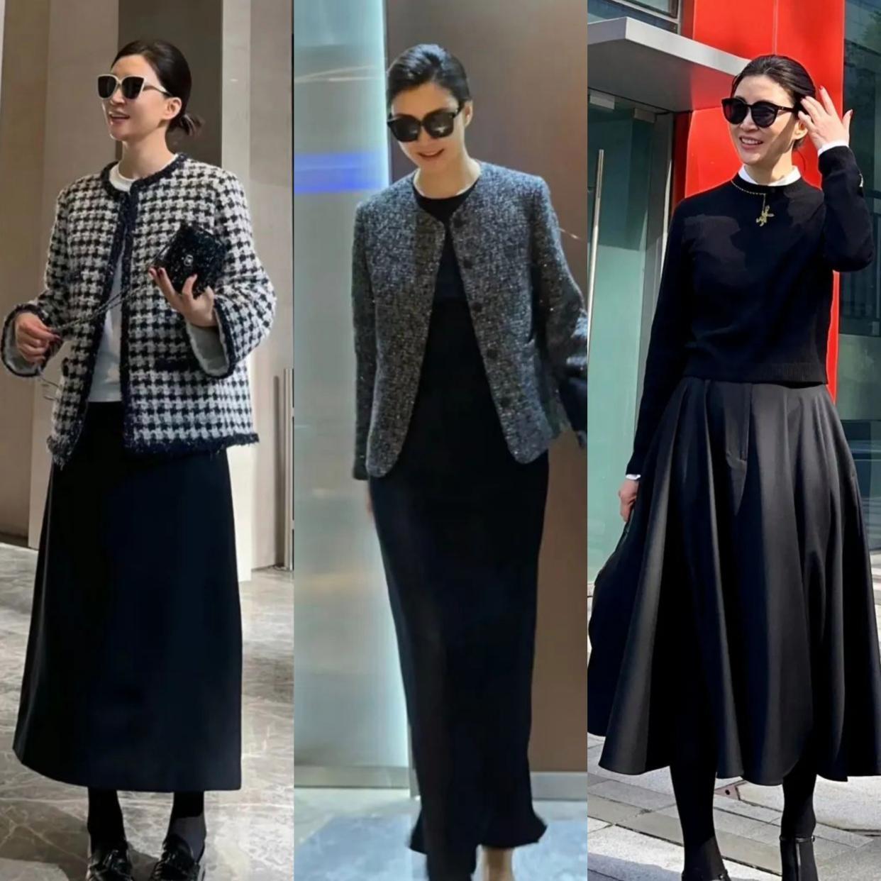 我們可以用小香風外套來配高腰的半身裙,高腰的黑色半身裙、或者深灰色半身裙,都可以配A字形的剪裁,上窄下寬的設計、大方耐看還可以包容腰胯部的壯碩。