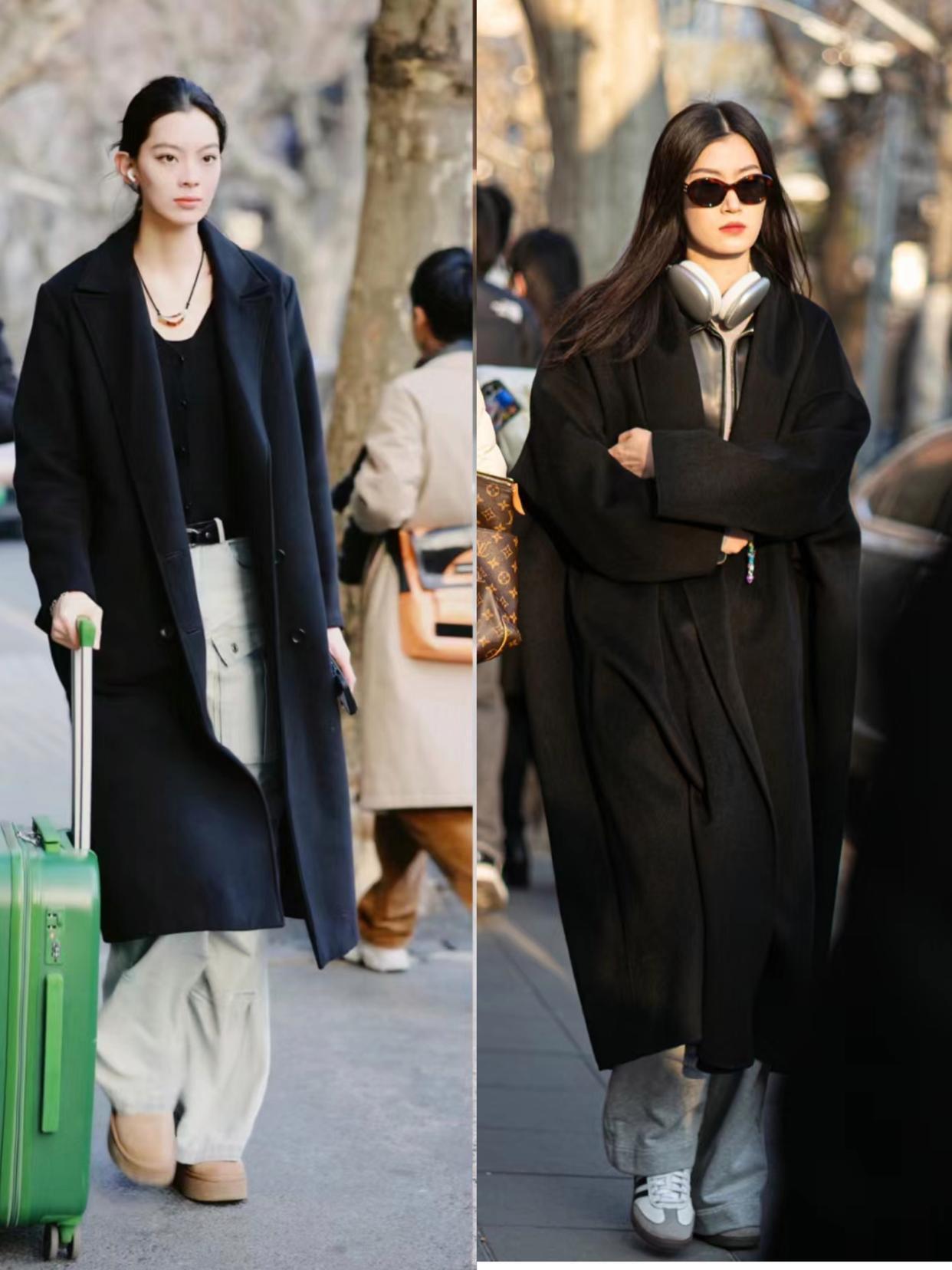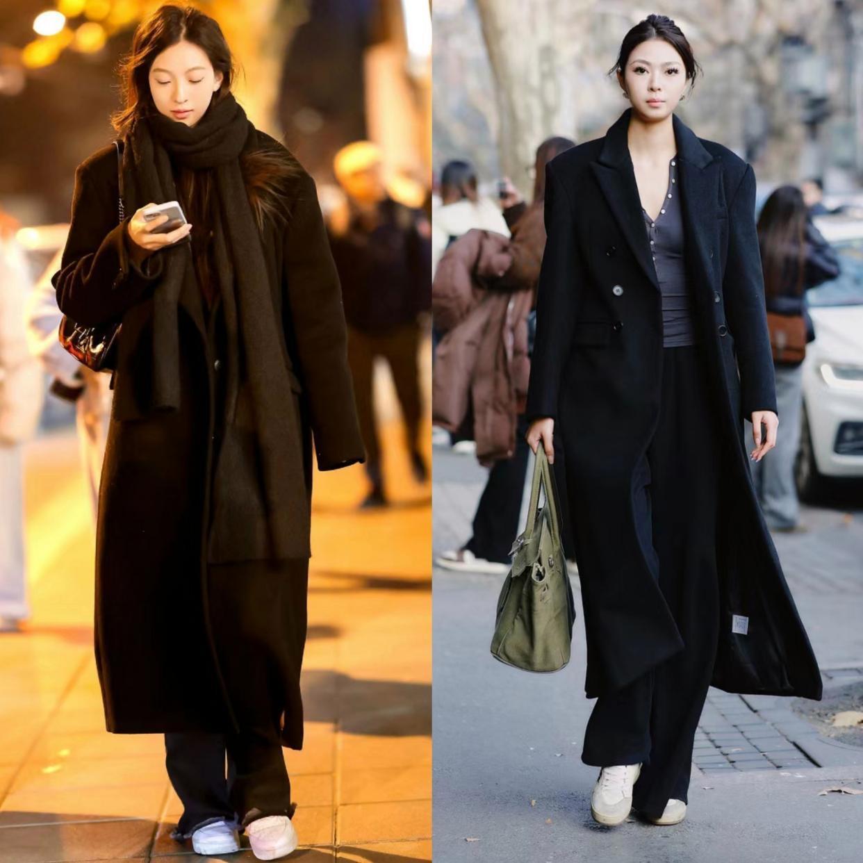 尤其是這種經典的黑色毛呢大衣,給人一種高級大方、時髦精緻的美。長款的黑色大衣,穿起來挺拔又高級。春季可以配V領針織衫,輕盈又時尚。