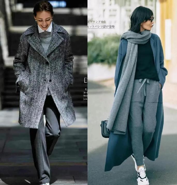 花灰色的毛呢大衣,搭配同色系的闊腿褲,呈現着更有力量的高級美。這種寬鬆的毛呢大衣,版型挺闊、舒適度更強,配闊腿褲來穿着,也很大氣。