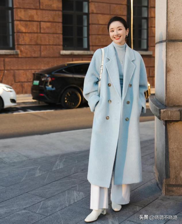 所有的彩色系單品都非常適合與白色結合,一方面白色自帶百搭屬性,怎麼穿都好看,另外,一方面白色能夠更好地綜合彩色的豔麗感,使得整體更加溫柔有氣質,所以大家在穿霧霾藍大衣的時候,完全可以選擇一件白色的毛衣內搭以及白色的闊腿褲,通過霧霾藍與白色的組合,彰顯更多的高級氣質,而且內裏都用同種白色進行銜接的時候,整體會更加的流暢利落一些。