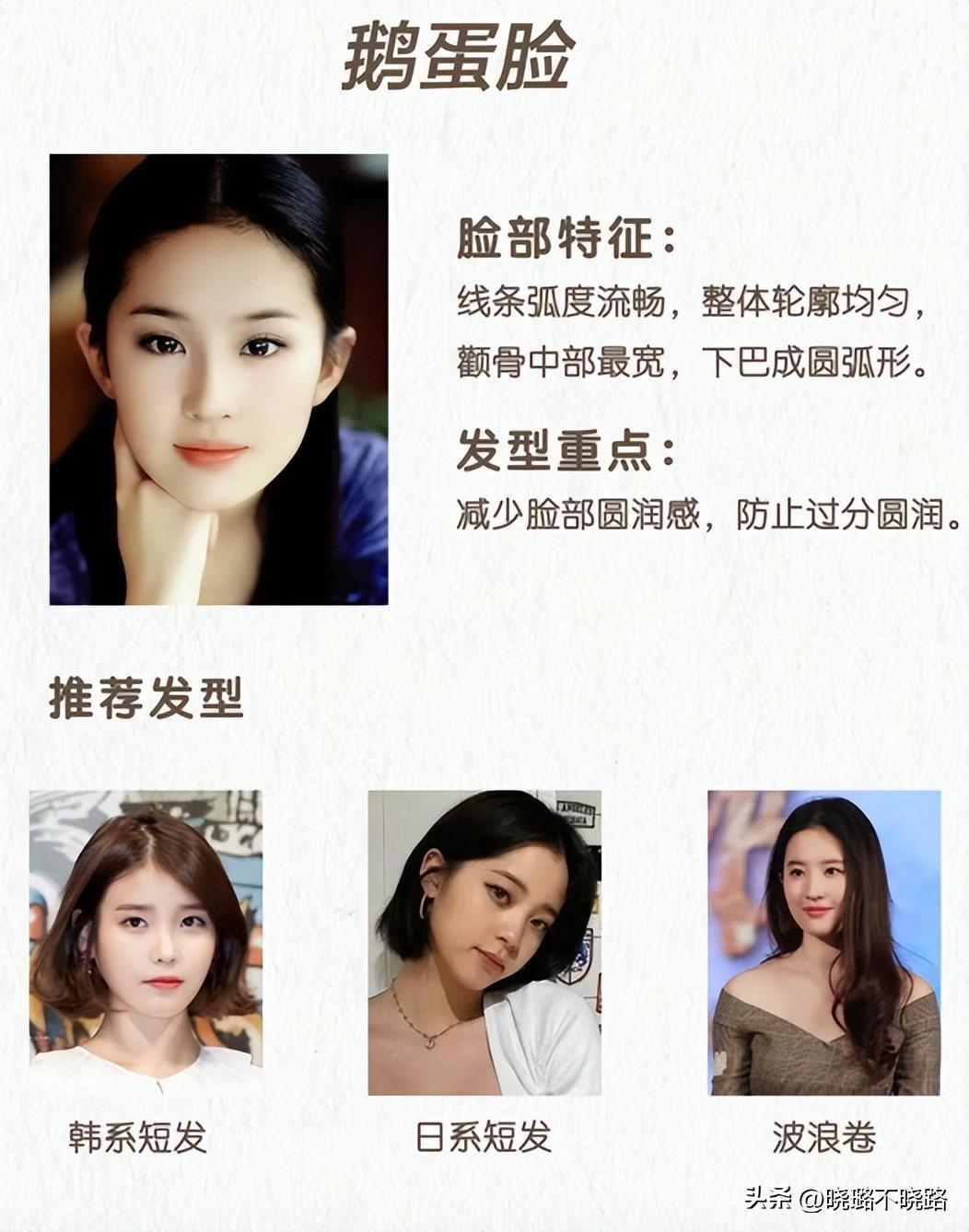 鵝蛋臉的女人,天生優勢,基本上屬於美人胚子,大部分的髮型都可以駕馭,臉型上寬下窄,面部線條流暢。若要在各種髮型中,選到一款最適合自己的,就選韓系或日系短髮,頭髮側分蓋耳溫柔中帶有俏皮靈動。五官大氣的鵝蛋臉女人,推薦波浪卷,營造大女人氣場。