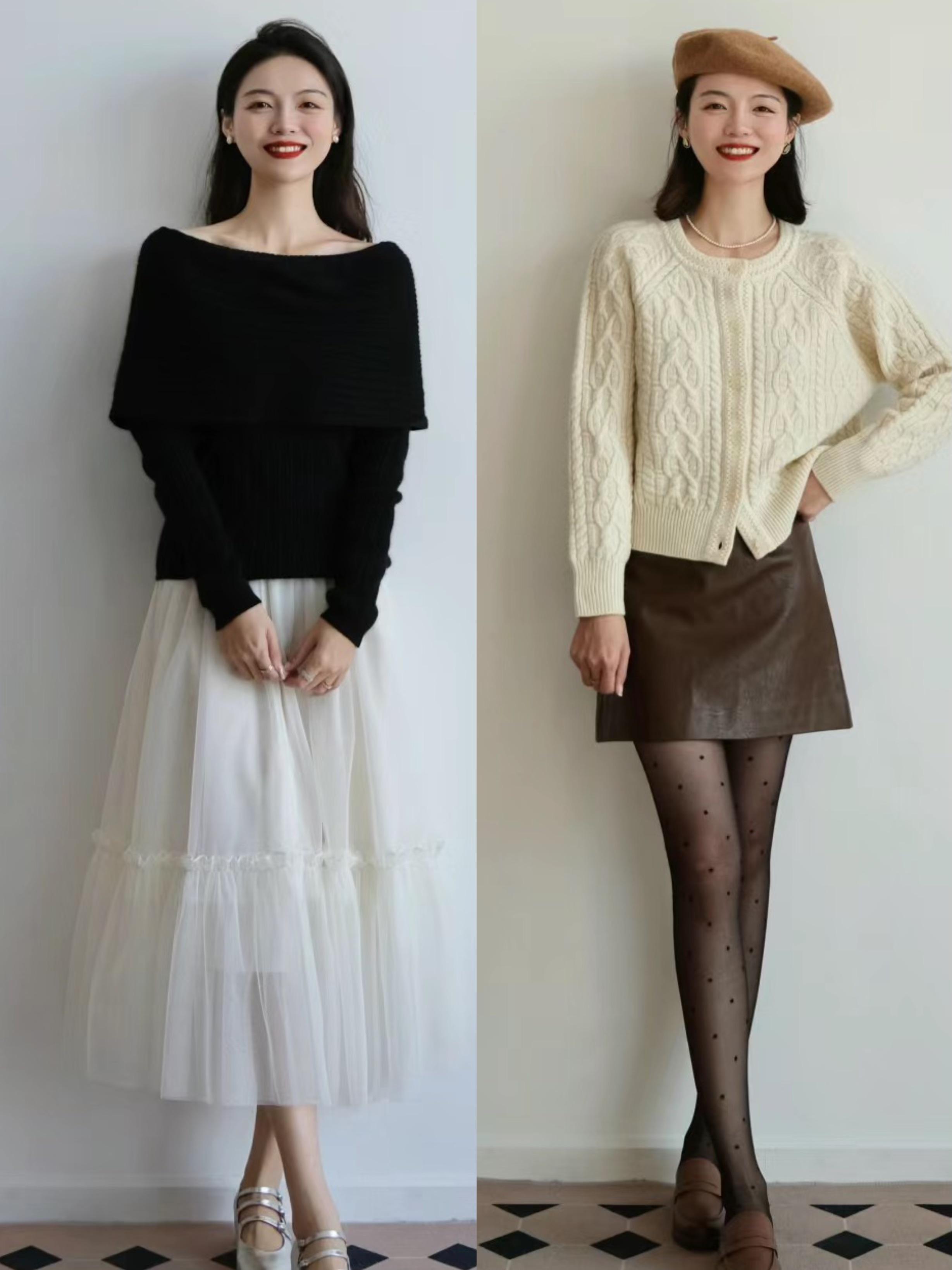 不管是細膩的針織衫、還是絞花元素的針織衫,在梨型身材的穿搭中都更加溫柔內斂。選擇針織衫的時候,我們可以搭配短款的版型,更加利落洋氣。