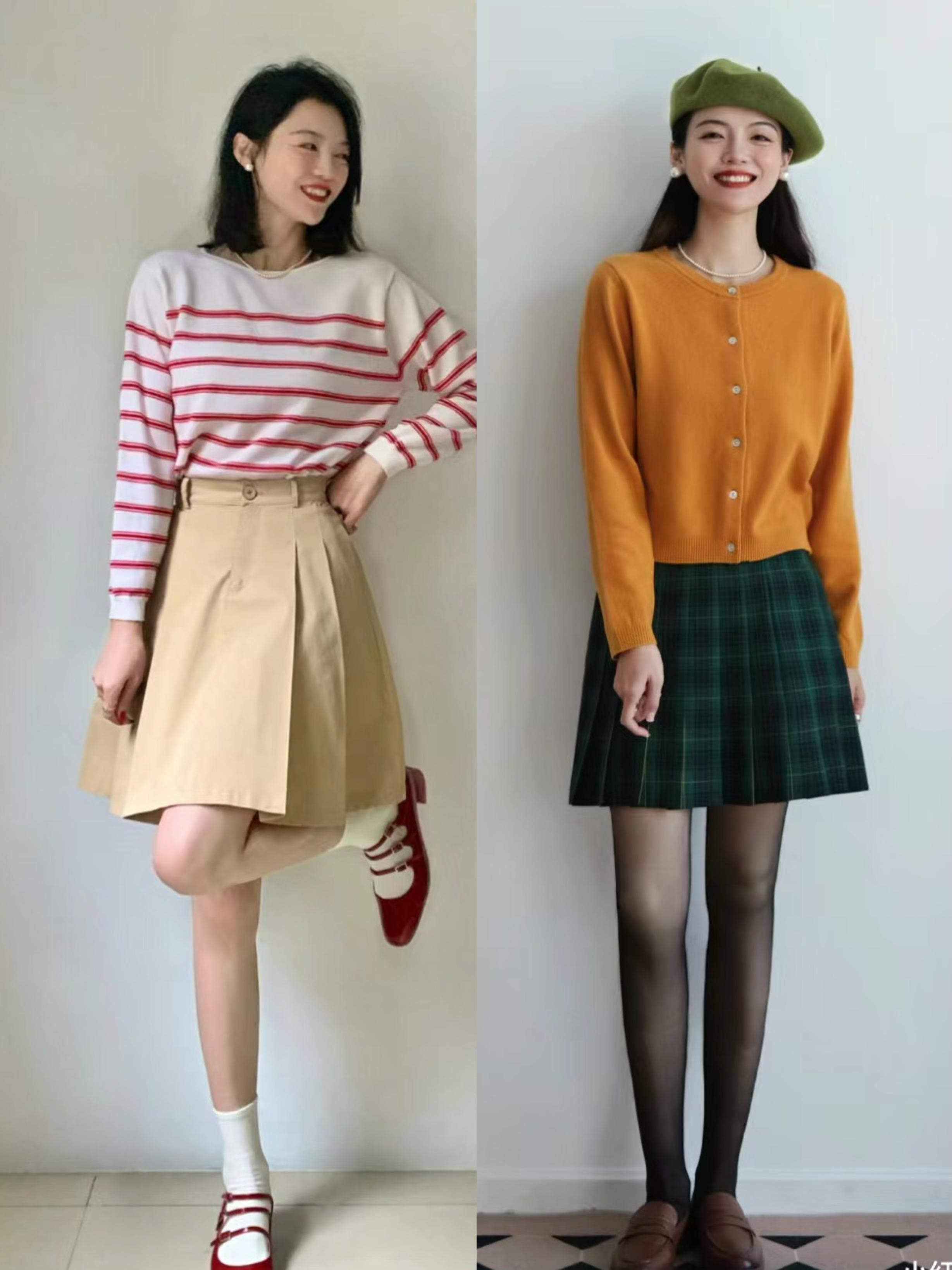 在梨型身材的穿搭中,最常見的穿搭問題就是容易顯得腰粗胯寬了。而針織衫+小裙子的組合,就可以更自然的避免這個問題。