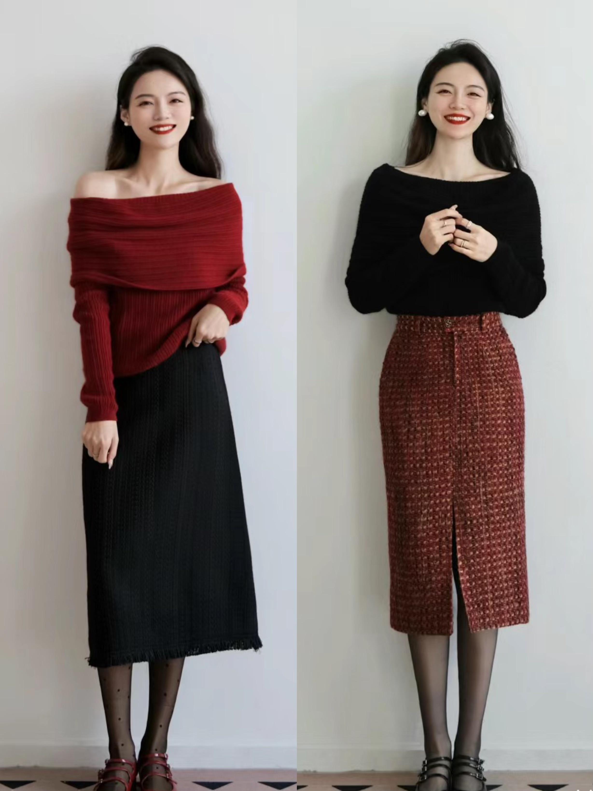比如酒紅色的一字肩針織衫,可以直接搭配經典的黑色半身裙。黑色半身裙選擇了高腰的款式,流暢的剪裁也很利落。早春季節、這樣的紅黑配色醒目又顯貴。