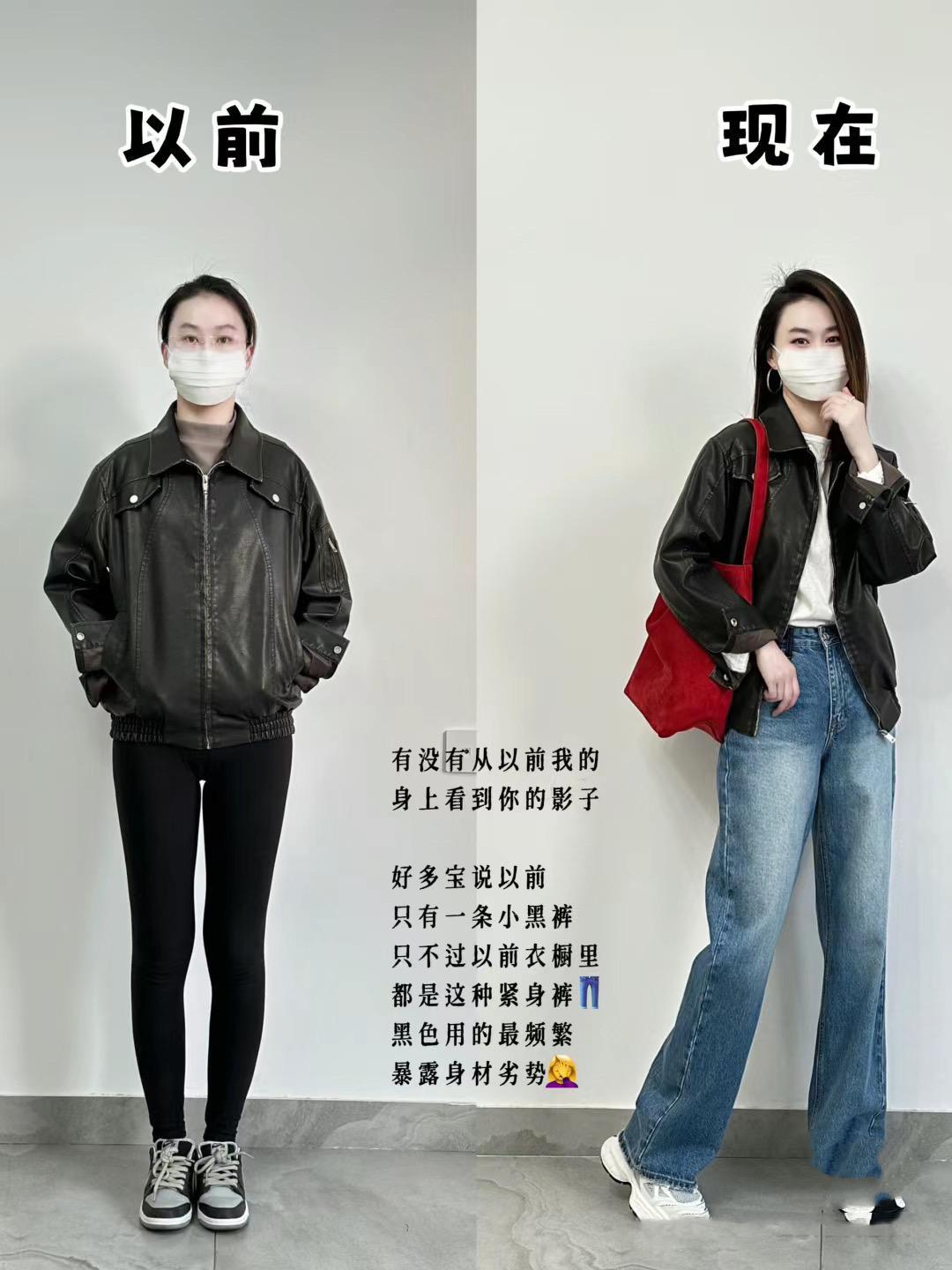 學會搭配之後,更加懂得配色和款式的組合。休閒風的黑色皮夾克,搭配白色T恤清爽又帥氣。一條高腰的直筒牛仔褲,也勾勒出腿長一米八的氛圍,挺拔的身形也是又酷又美。