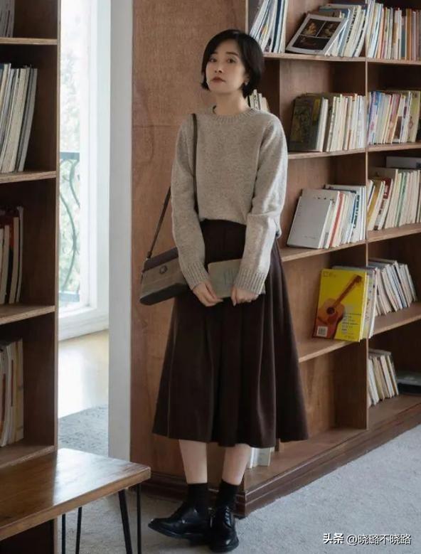 針織的柔軟搭配過膝裙凸顯女性魅力,也滿足冬季的保暖性,針織的單品最好是具有一定的貼身,這樣才能和過膝裙組合出對比的鬆緊感。同時修飾力度也比上寬下寬要好,尤其適合中年女人發福的身材特徵。