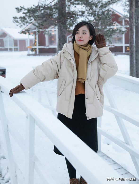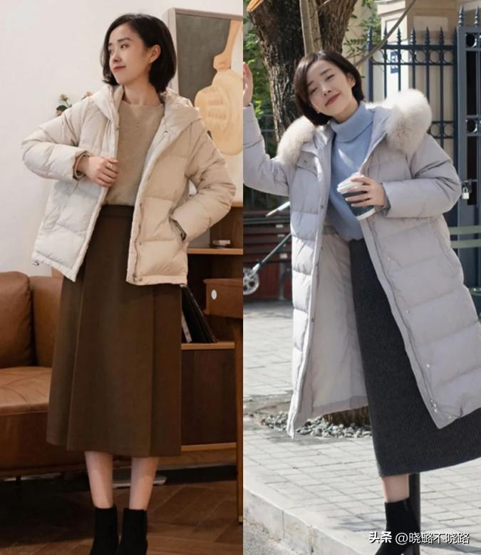 由於羽絨服較爲厚重,建議選擇直筒款式的過膝半身裙或修身的針織裙來搭配,這樣能夠避免過於臃腫的效果。對於身材嬌小的女性,短款羽絨服搭配高腰過膝半身裙,能夠修飾身材比例,視覺上會增加整體身高。而較長的羽絨服搭配長款半身裙,形成層次感讓造型更加有型。