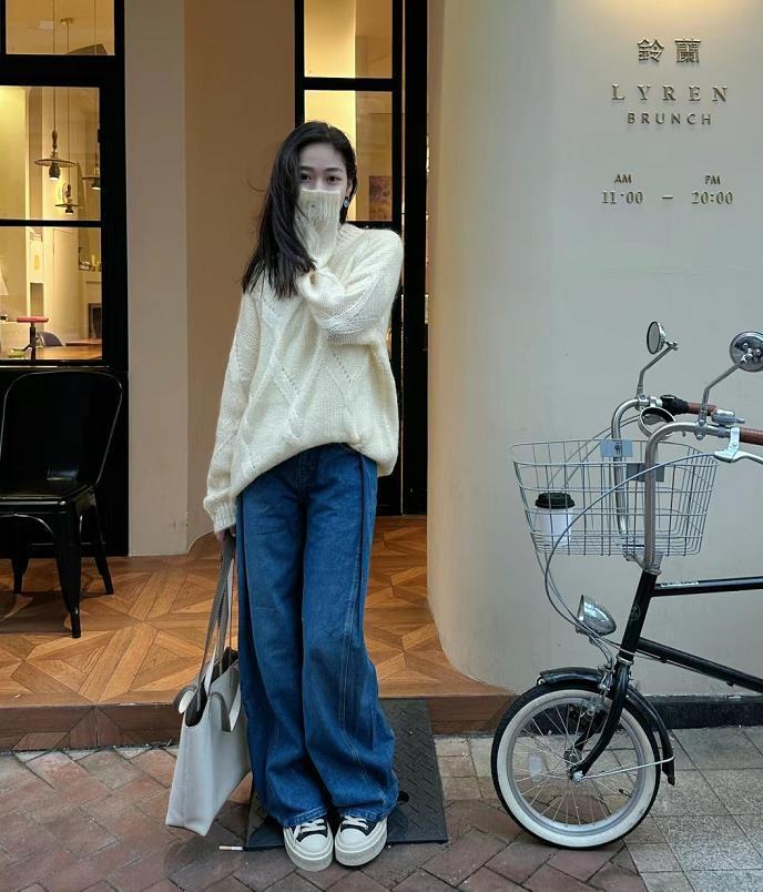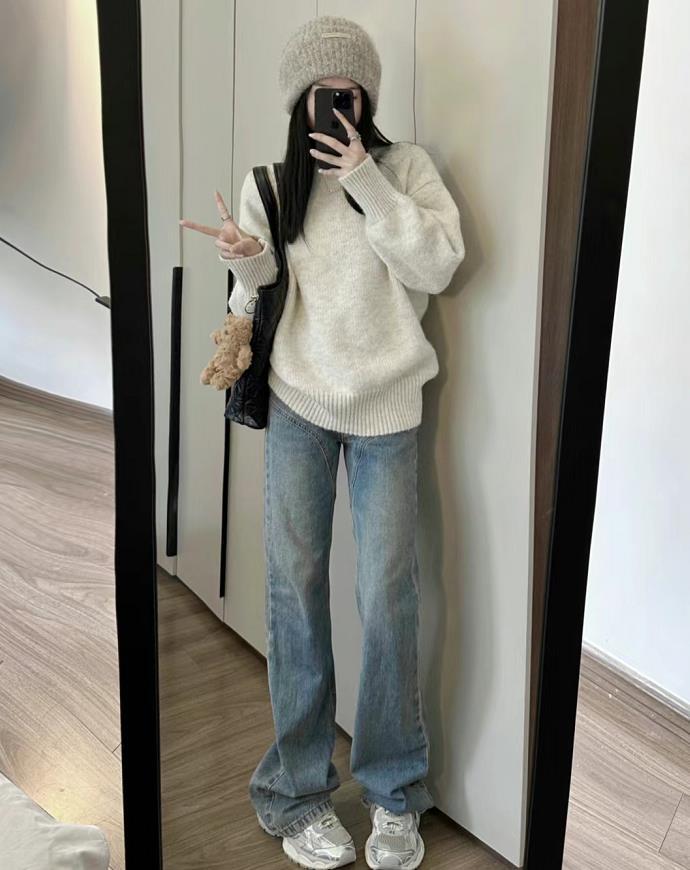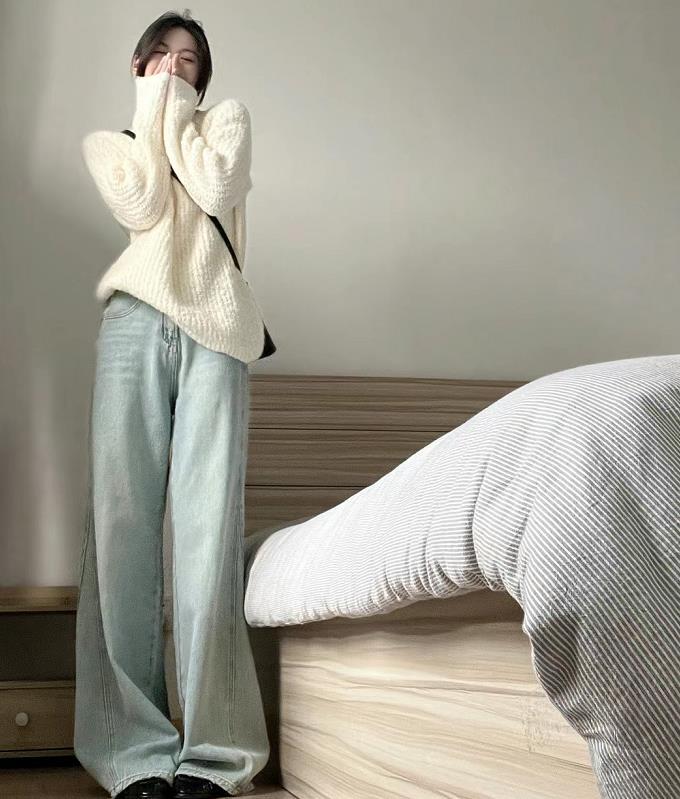 毛衣、牛仔褲,簡簡單單真的好舒服啊,整體的配色是很乾淨清爽的,白色寬鬆毛衣+拖地牛仔長褲,垂墜感十足的褲子,穿起來不僅沒有壓個子,反而是很顯腿長。