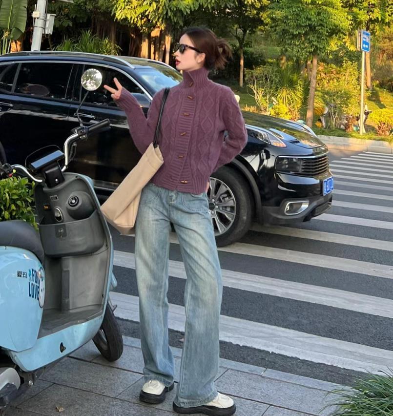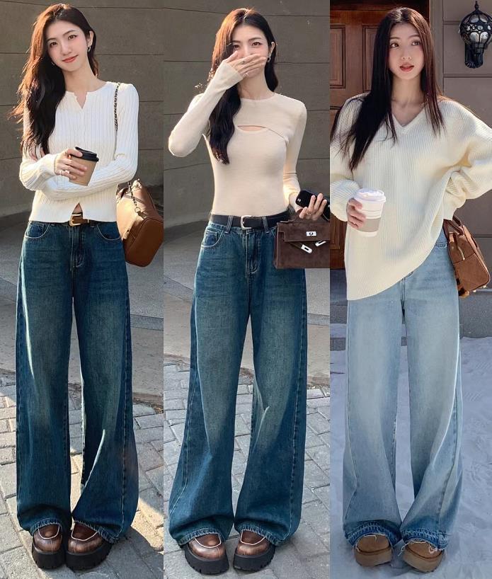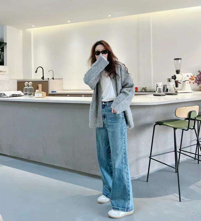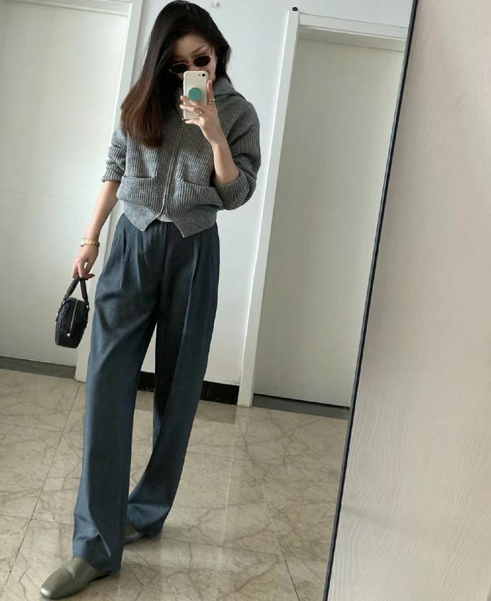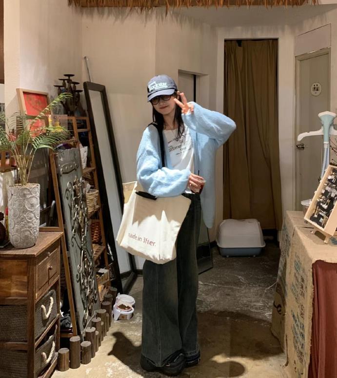 藍色的毛衣開衫,看起來就好韓好乖啊,低飽和度的藍色,穿起來不僅顯白,還非常襯膚色。寬鬆的版型之下,更顯瘦舒適了。寬鬆的牛仔闊腿褲,讓你更添隨性的味道。