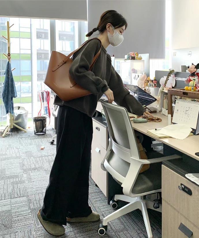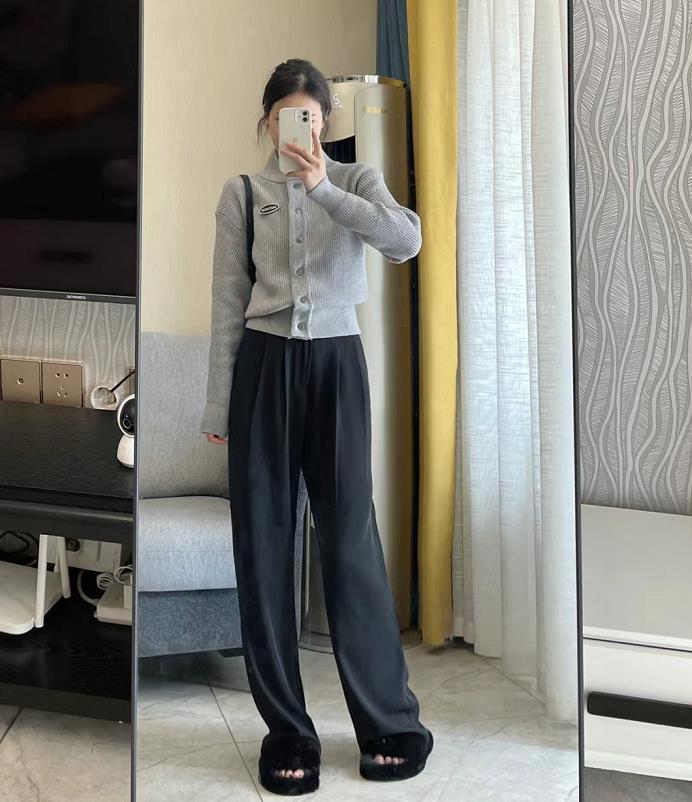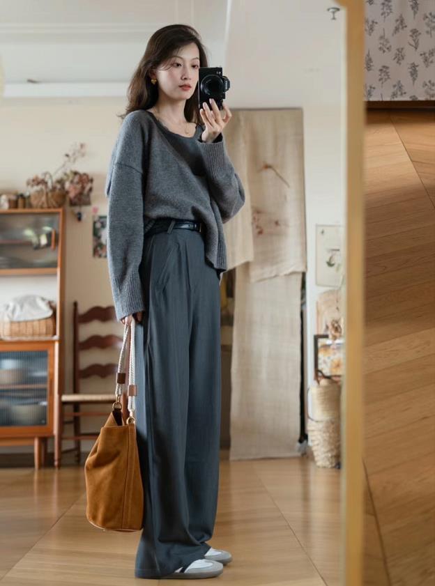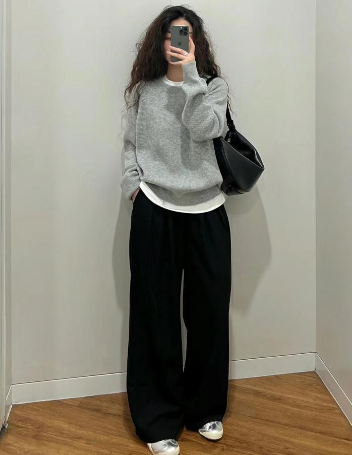 穿上秒變紙片人的西裝褲,直筒的褲型,加上垂墜感極佳的面料,上身後輕鬆拉長腿部線條。顯瘦又顯腿長,選擇與褲裝同色的毛衣,基礎色和極簡的穿搭,怎麼都不會出錯。