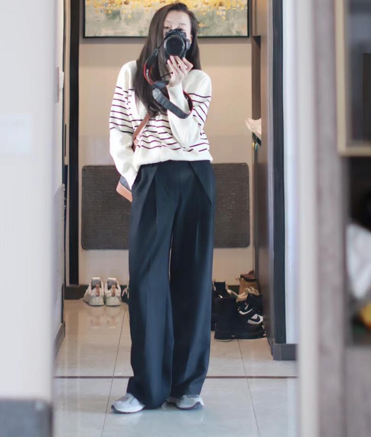 黑白搭配是永遠都不會出錯的啦,條紋毛衣與黑色闊腿西裝褲,簡繁的組合,顯層次又時髦。再加上一雙運動鞋,舒適休閒又高級。