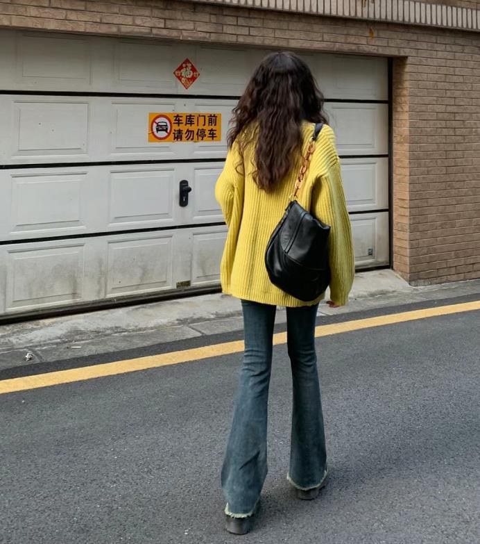 毛衣與牛仔褲的組合,也是超級經典耐看和時髦的,比起配西裝褲更多了幾分青春與活力。亮色的毛衣+牛仔微喇褲,一整個被氣質住了。