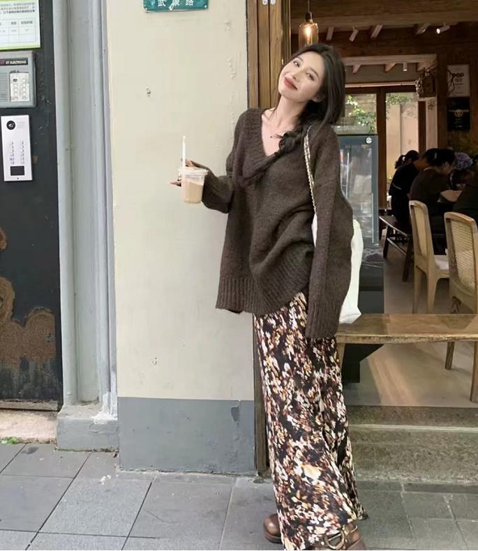 美拉德風色的大毛衣,喜歡這種寬鬆又帶着慵懶感的款式,加上v領的設計,上身後簡直不要太顯瘦了。選擇一條花半身長裙,一簡一繁的組合,不僅打造出層次,還頗有風情。