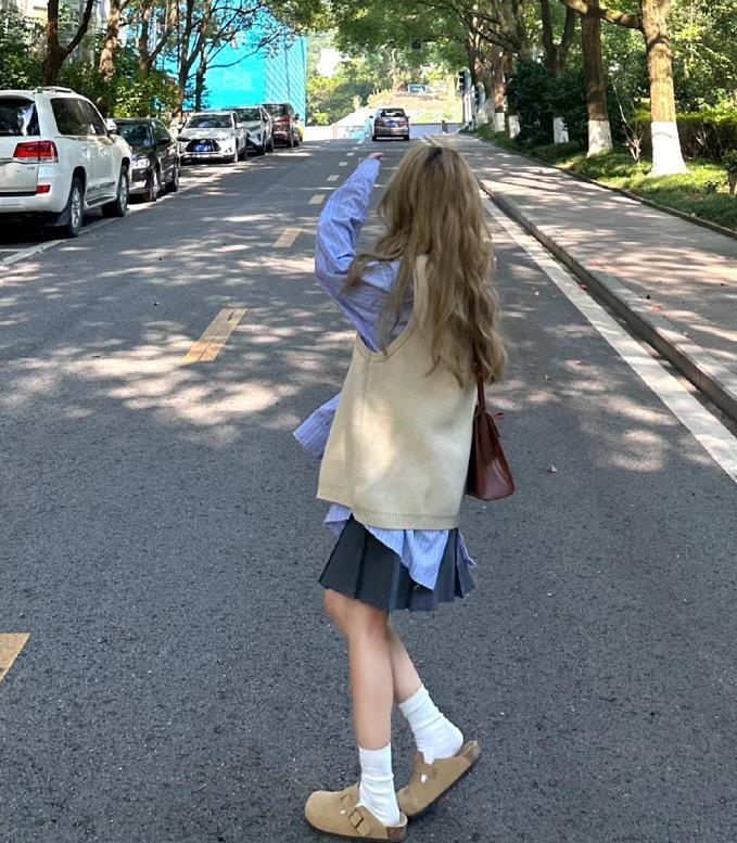 我愛疊穿,在早春,疊穿的組合最合適了,毛衣馬甲+藍色襯衫疊穿,不僅能打造出層次感,還很時髦。現在溫度回升了不少,南方的小姐姐可以配條短裙,瞬間就拉長腿部線條。
