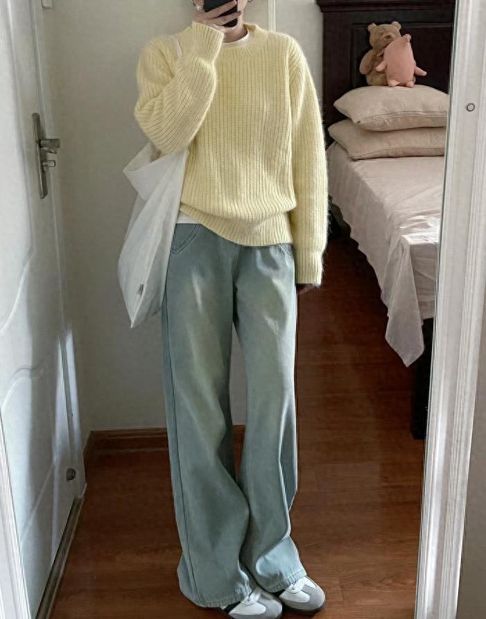 嫩黃色的套頭毛衣,這個顏色是真的非常好看,穿起來可以把整個嫩嫩的,好適合現在的季節。搭配小碎花牛仔褲,一整個被韓住了。