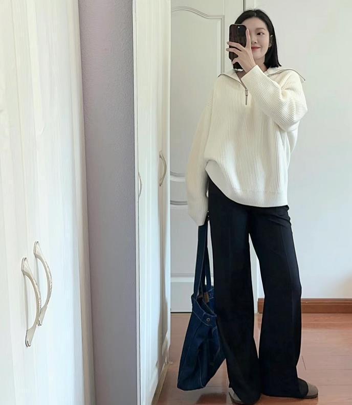 時髦穿搭的盡頭就是極簡,白色毛衣+黑色西裝褲,毛衣的亮點在大翻領,拉鍊的設計,細節感十足。將其稍微拉下來,露出一點鎖骨更顯瘦。