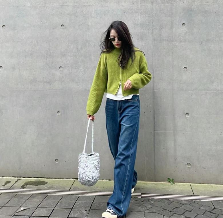 我愛亮色,特別是在一些沉悶的季節裏,亦或者是春天,都可以爲自己選擇一件亮色的單品。這件綠色毛衣也太好看了吧,直筒闊腿拖地牛仔褲,上身一秒就拉長了腿部線條,讓你輕鬆就擁有大長腿。