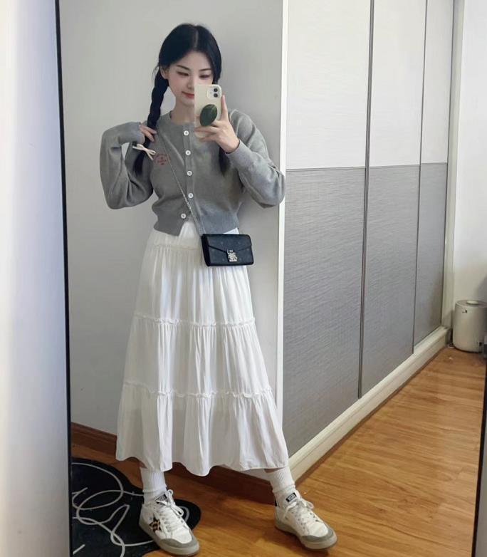 春天真的很喜歡穿針織衫,柔軟舒適的材質,哪怕是貼身穿也沒有關係,利落的短款,就是專爲小個子女生打造的。搭配的白色半身長裙,形成了上短下長的效果,賊顯高挑。