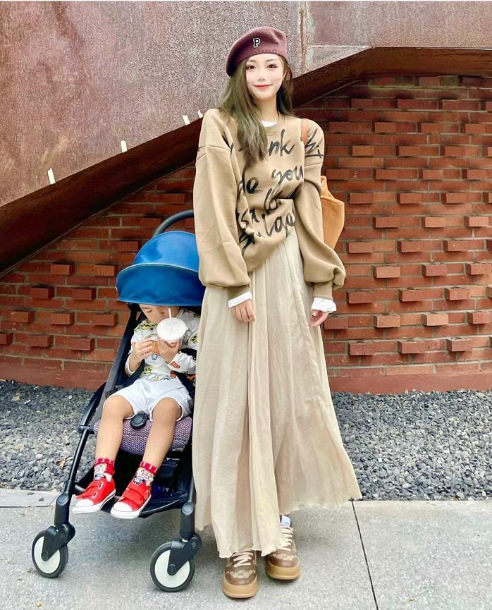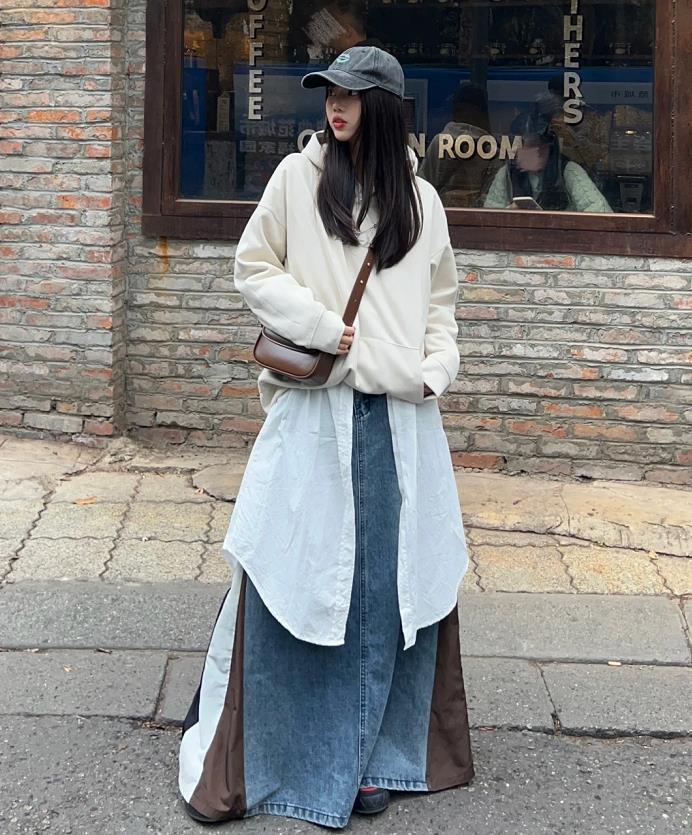 衛衣直接穿,或疊穿都行,稍微把下襬塞一點進去裙子裏面,就能很好拉長整個身材比例了。