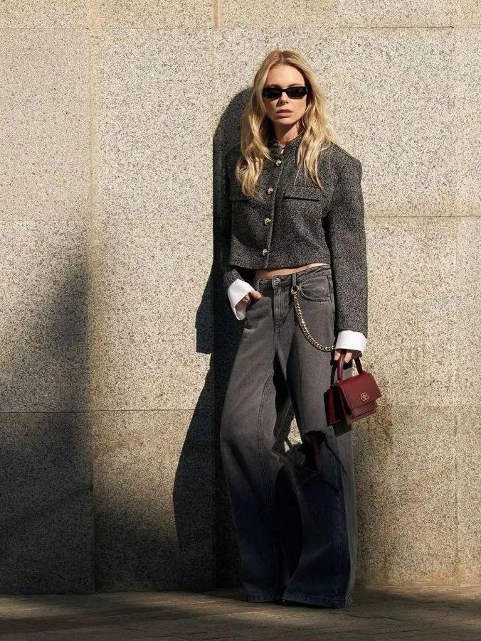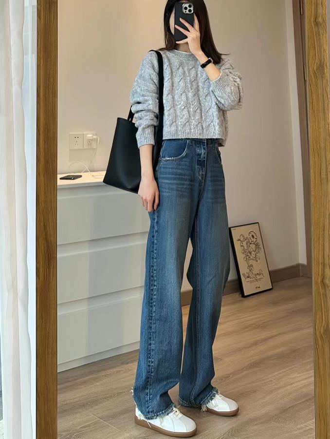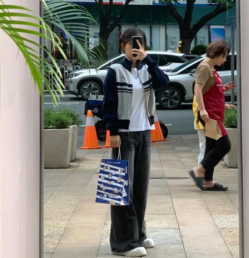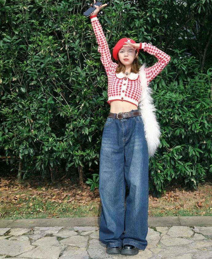 上短下長就是小個子的最佳搭配,完全看不出本人的實際身高,紅白格子針織衫+高腰闊腿牛仔褲,寬鬆的褲子,顯瘦藏肉又帶點隨性。