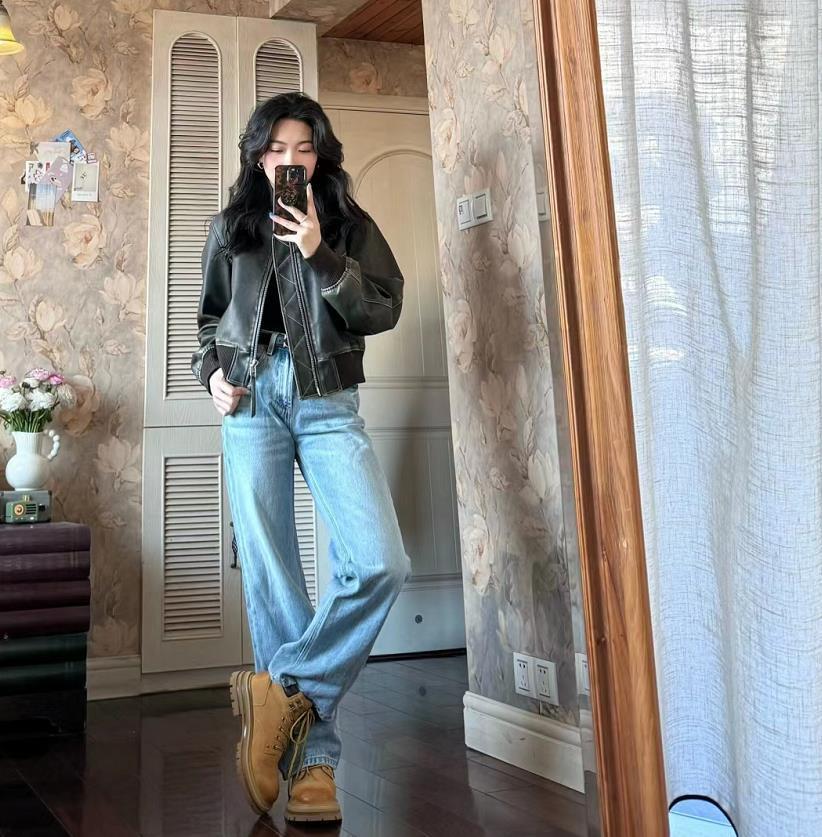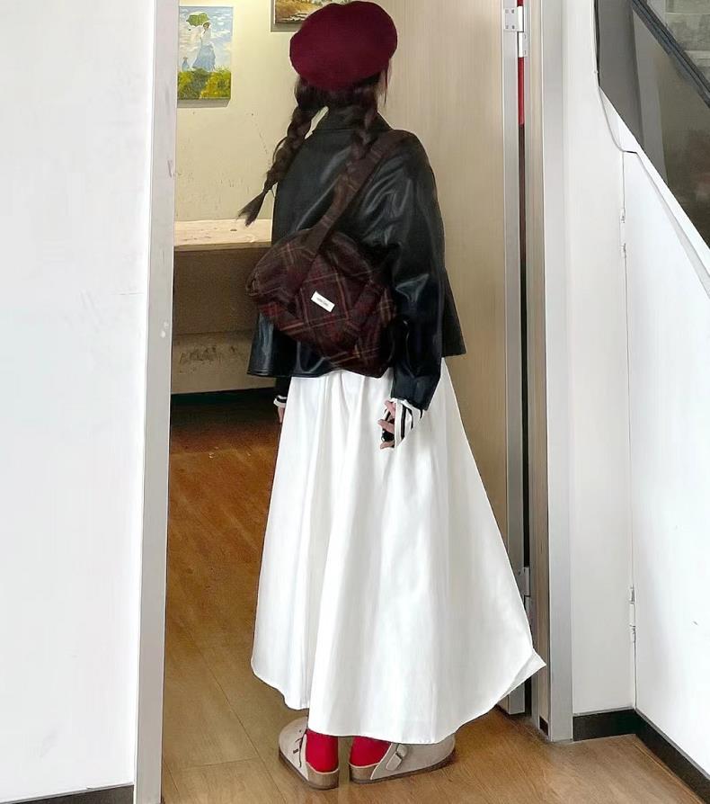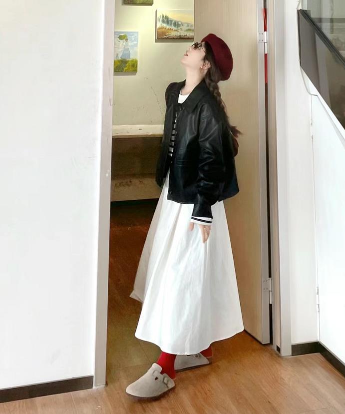 今年早春,出門給自己選擇一件皮衣外套來穿吧,小短款還挺好看的,利落又不是高挑。搭配白色半身長裙,輕鬆就打造出高挑感。