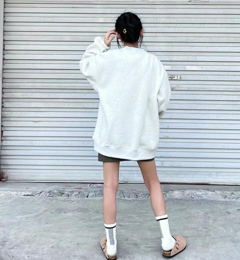 溫度逐漸回暖的春季,當然要選擇上長下短的穿搭啊,這種寬鬆長衛衣,誰不愛?下身不管是配短裙,還是短褲都可,爲了增加造成層次感,利用起襪子外露就行。