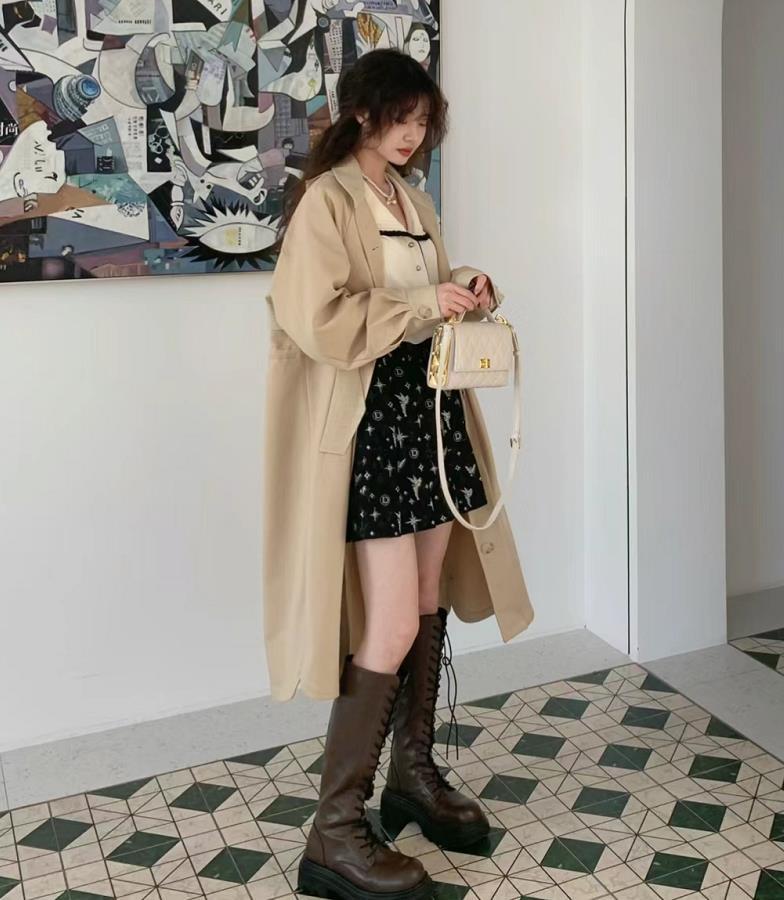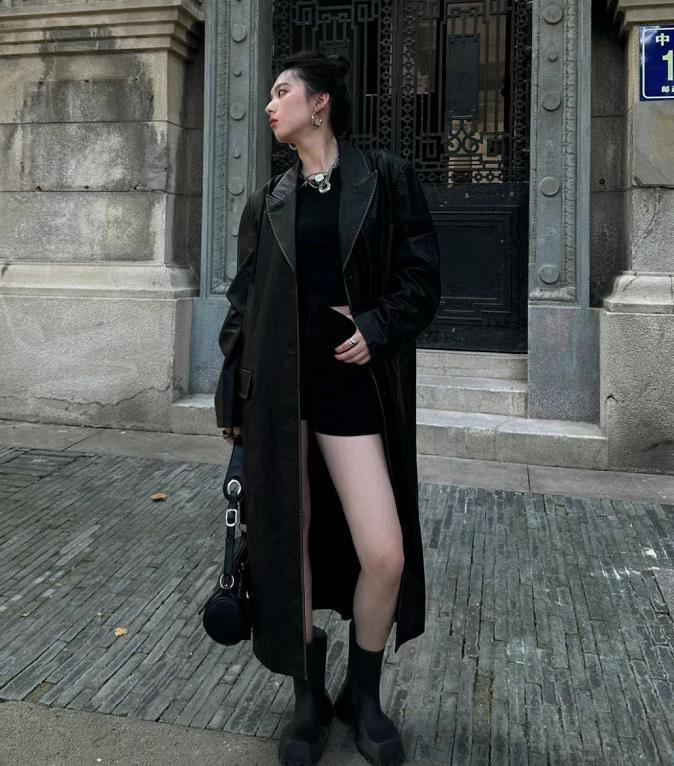 黑色皮質長款風衣,穿起來真的好颯,超愛的,就算你是小個子女生,也是可以大方穿起來的。內短外長的組合,很顯身材,也不失高挑感。
