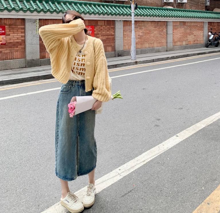 充滿色彩感的春季穿搭,讓人瞧着一點都不覺得單調沉悶,很吸睛洋氣,奶黃色短毛衣開衫+牛仔開叉半裙,輕鬆拉長腿部線條,也顯瘦。