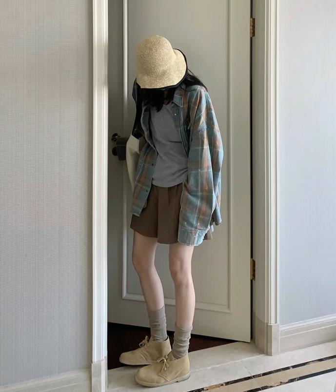 上長下短的組合就是剛好適合春夏交際的天氣,復古色系的格紋襯衫外套,裏面配一件純色t恤就行。下身是一條短褲,就這麼露出雙腿肌膚來,除了在視覺上顯高挑之外,還好看。