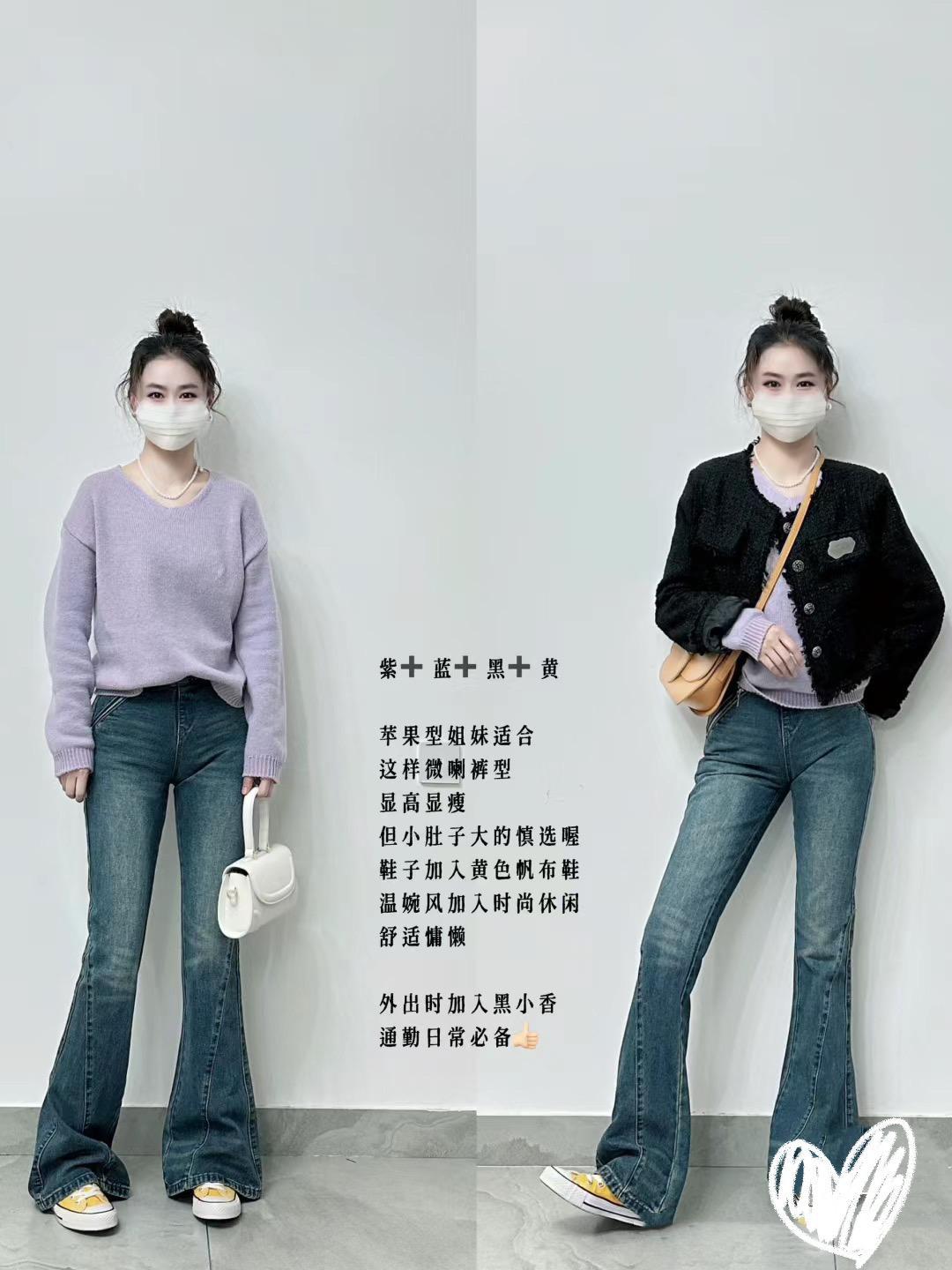 尤其是蘋果型身材的女性,可以選擇這種寬鬆針織衫+高腰微喇褲的組合。只要腹部不是特別厚重,都可以選擇這種高腰的微喇褲來搭配,顯得比例更優越。