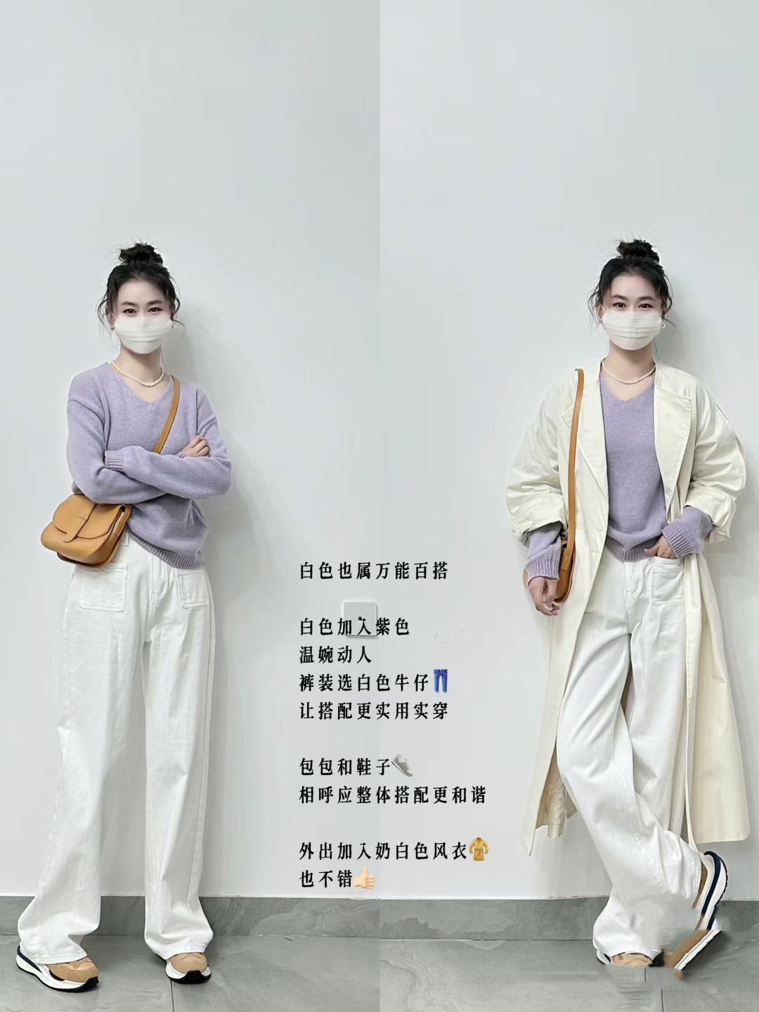 高腰的白色闊腿褲,搭配慵懶風的針織衫,既舒適又自在。這種淺色系針織衫與白色闊腿褲的搭配也非常協調,疊搭米白色風衣外套依然擁有足夠的氣場。