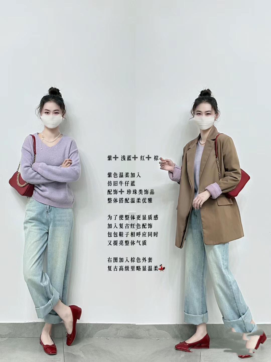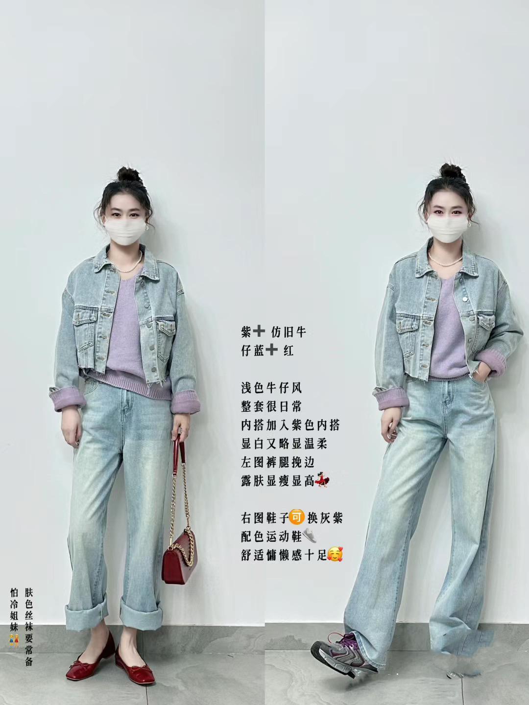 短款的牛仔外套和直筒的牛仔褲,可以配同色系的款式,整體風格更加協調。像這種牛仔套裝,疊搭色彩溫柔的針織衫,有一種柔和大氣的美,慵懶舒適、率性自在。