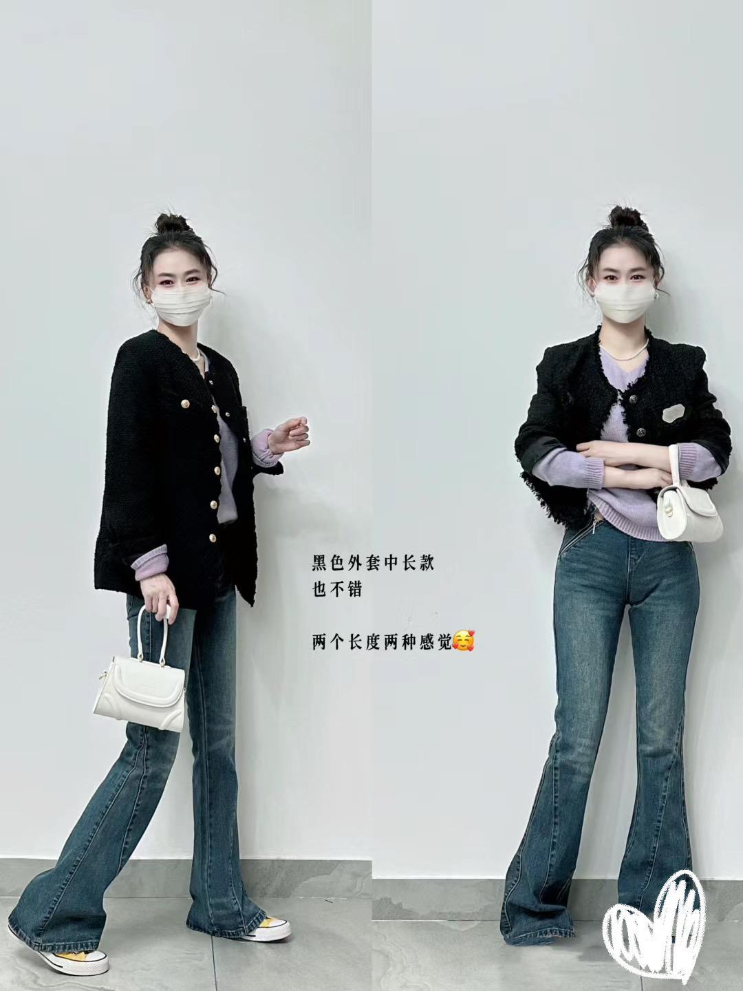 針織衫+高腰微喇褲的搭配,時髦又慵懶。如果通勤上班,或者出入正式的場合,我們可以搭配黑色小香風外套。