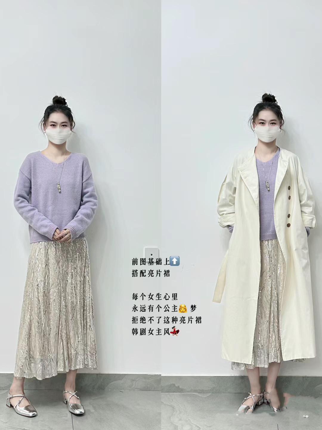 如果想要一種慵懶又浪漫,精緻又迷人的穿衣風格。我們可以用色彩柔和的針織衫,來搭配亮片裙。每個女生心裏,都有一個公主夢,這種亮片裙也是不可少的。
