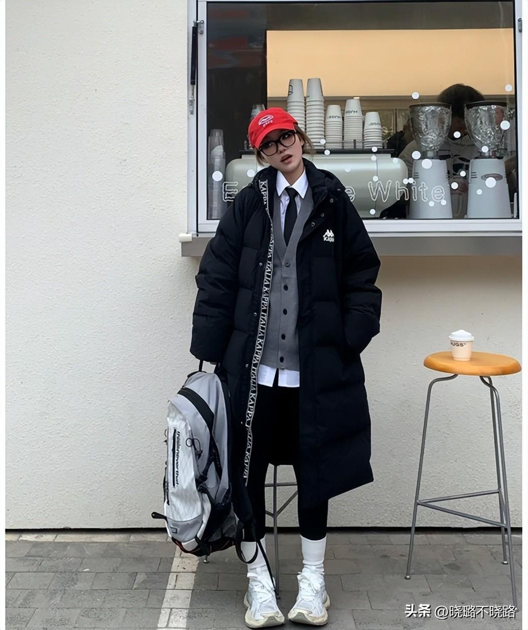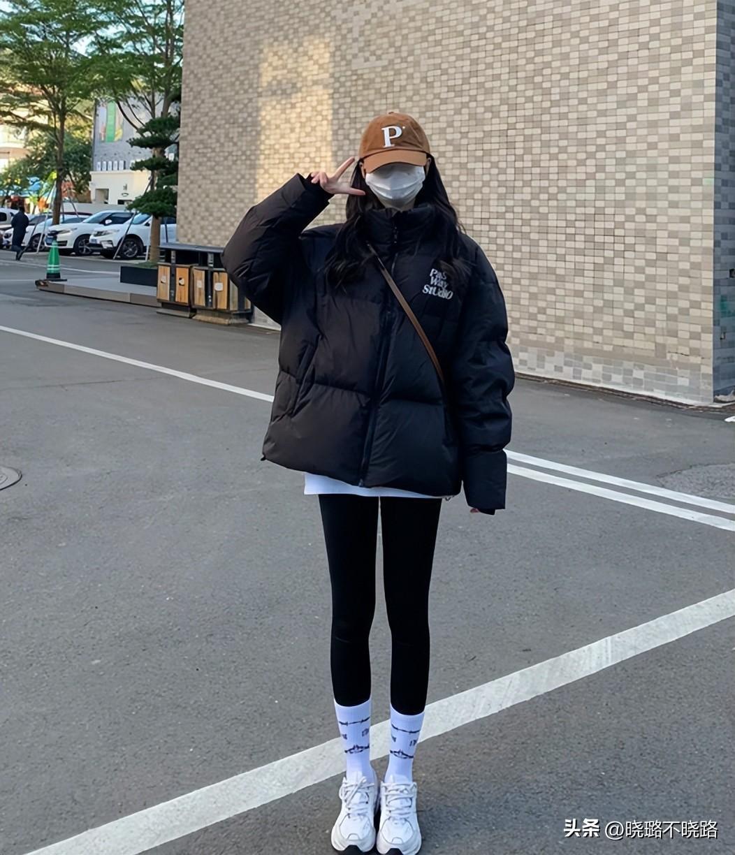 冬季最顯瘦的顏色,沒有比黑色更有話語權的色彩,它作爲整個穿搭的主色調,用黑色的羽絨服配黑色的鯊魚褲打造酷拽女孩的形象,而在小面積區域不要再用黑色的點綴,鞋子內搭選白色,塑造亮點,巧妙化解黑色的沉悶。