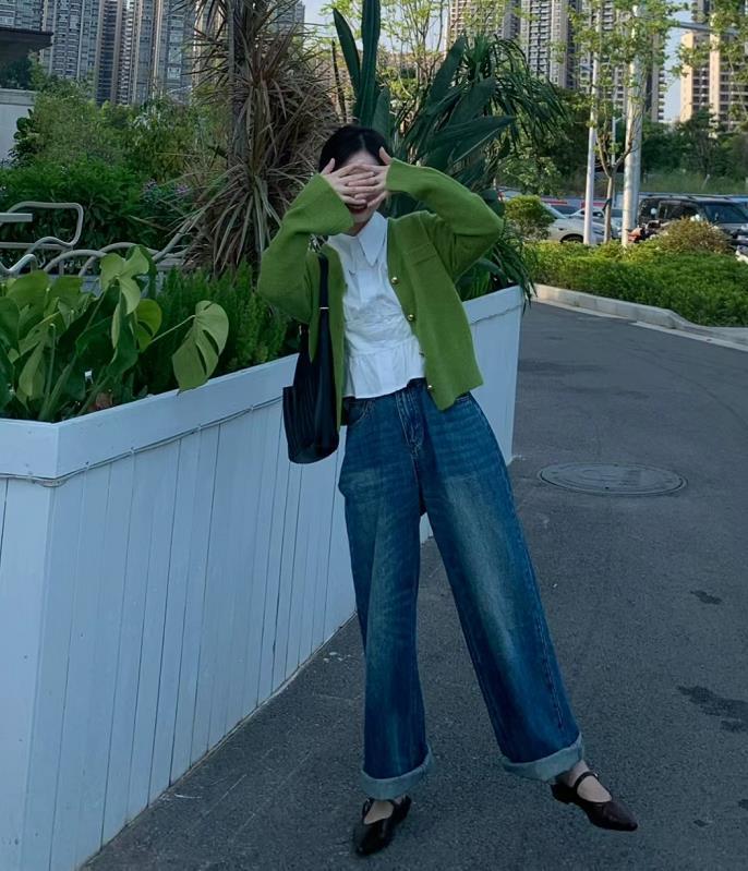 這個春天的第一件綠色針織開衫,好喜歡呀,簡單韓系的穿搭,我是會一直都愛,綠色短開衫+白襯衫+牛仔褲,就是韓範十足的組合了。