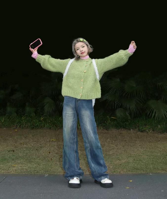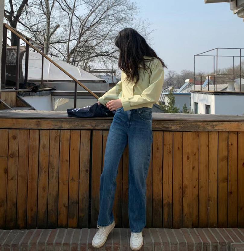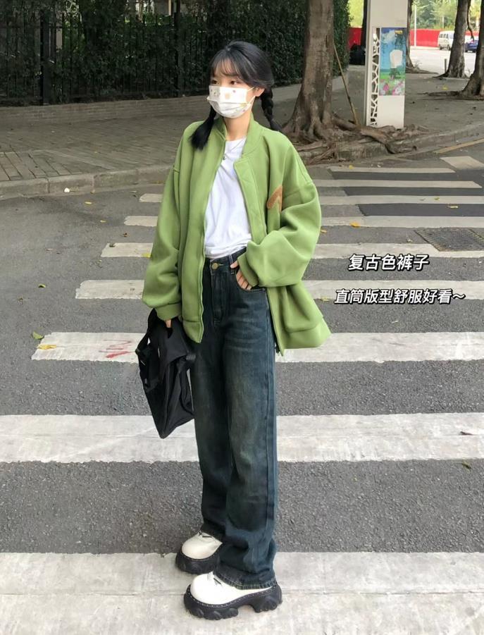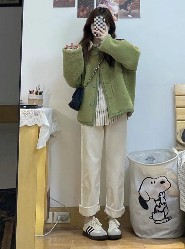 150+的小個子真的建議嘗試下這套,絕美顯白的綠色,羊羔毛的材質,軟軟糯糯的穿起來很保暖。白色牛仔直筒褲,這條的版型很好,不顯胖。
