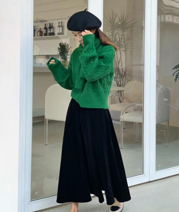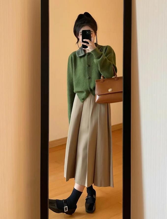 這個綠色毛衣好韓好顯白,第一眼看到就很喜歡了,卡其色百褶半身裙+綠色毛衣,一整個高級顯白,還溫溫柔柔的。
